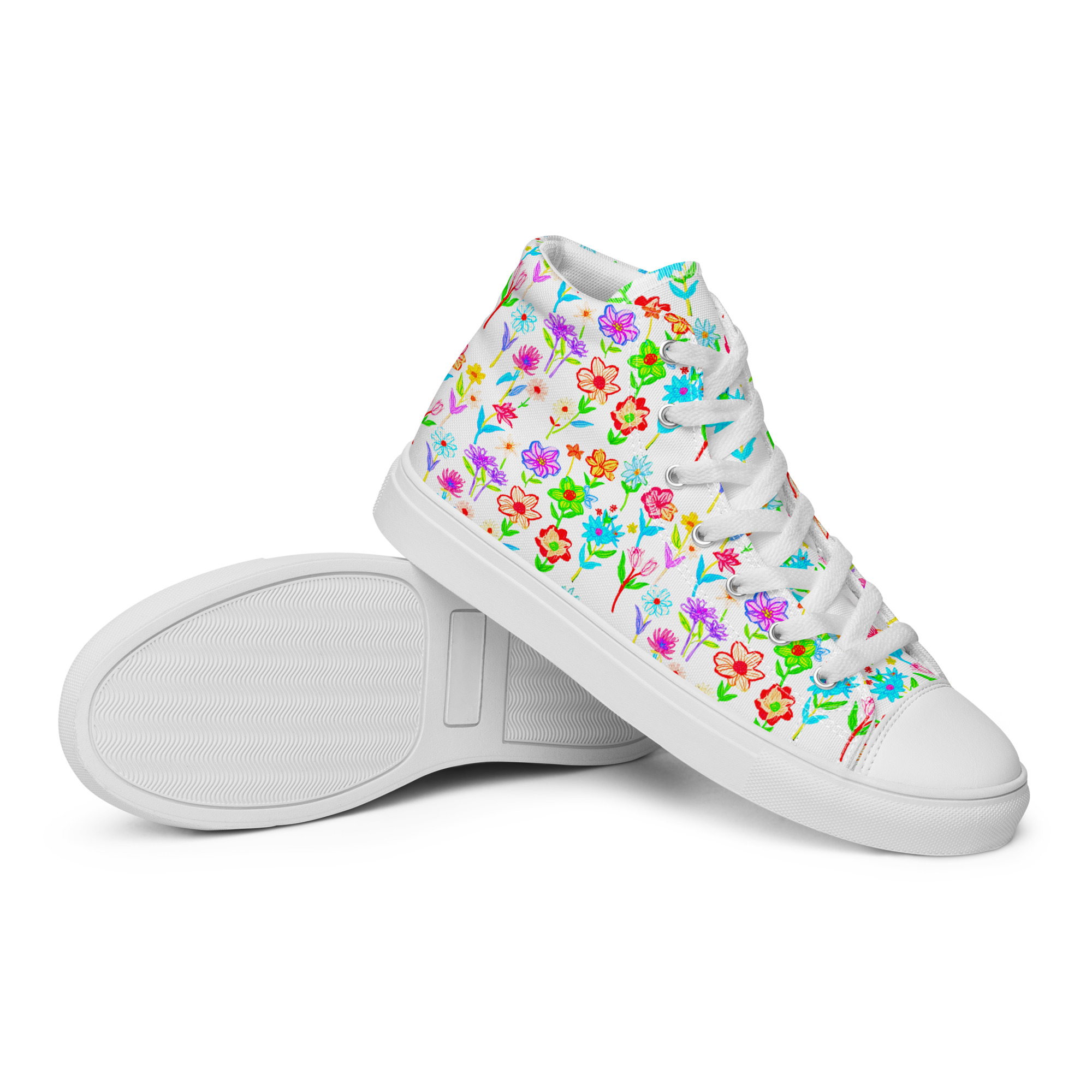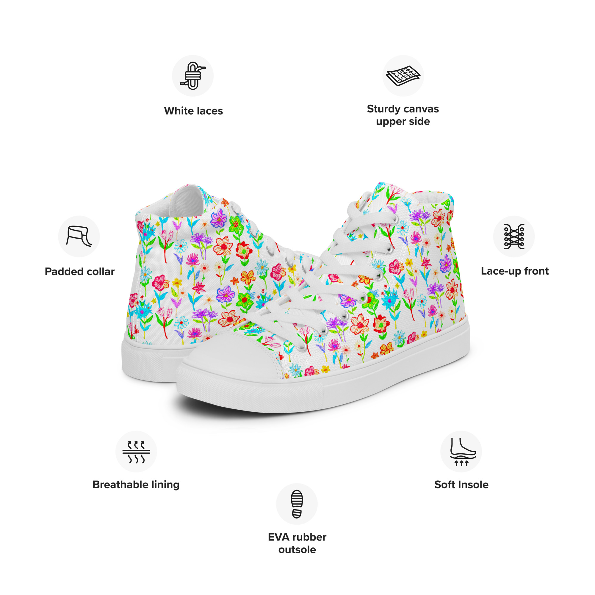 Remember to take good care of your feet! These shoes are made to fit comfortably across all sizes, with a strong build and a soft insole that supports every step, reducing fatigue. The classic and stylish Brilliant Flowers High Top Canvas Shoes are a fantastic choice for your wardrobe.