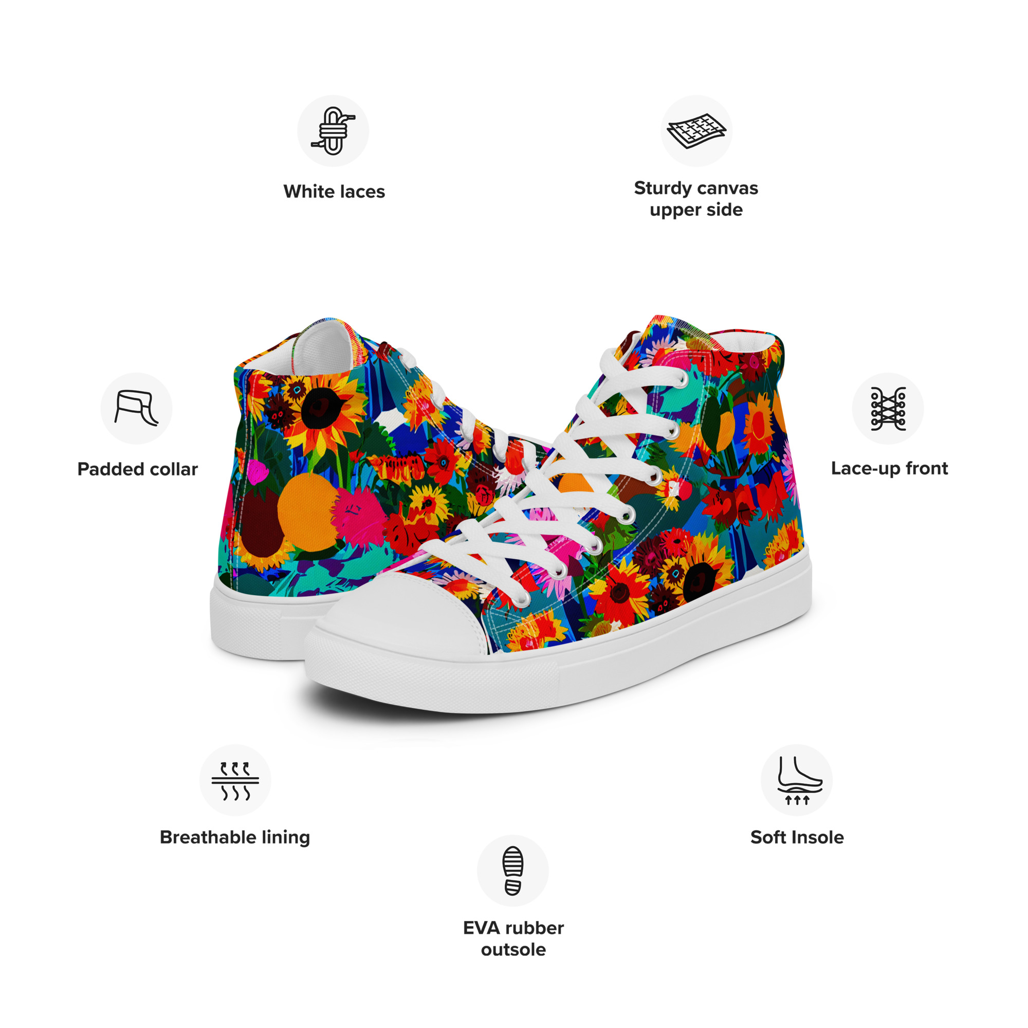 Remember to pamper your feet! The timeless and fashionable Colourful Summer Flowers Canvas Shoes are a perfect wardrobe update. With a 100% polyester canvas upper and a light EVA rubber sole, these shoes provide reliable comfort. Plus, the faux leather toe cap and reinforced build ensure they stay structured and durable.