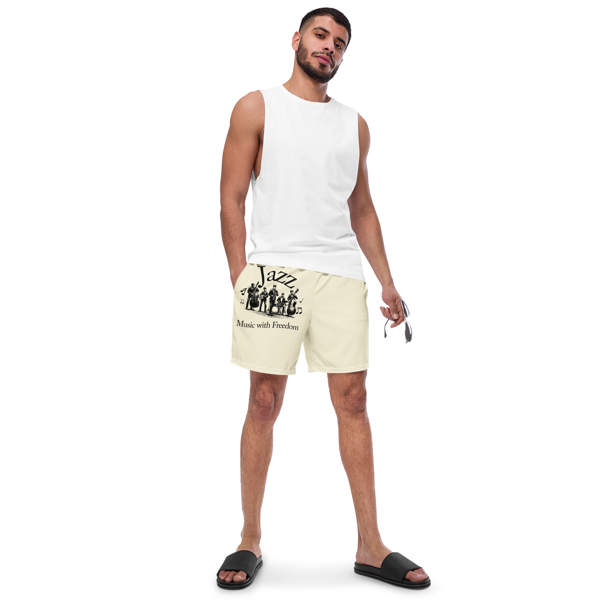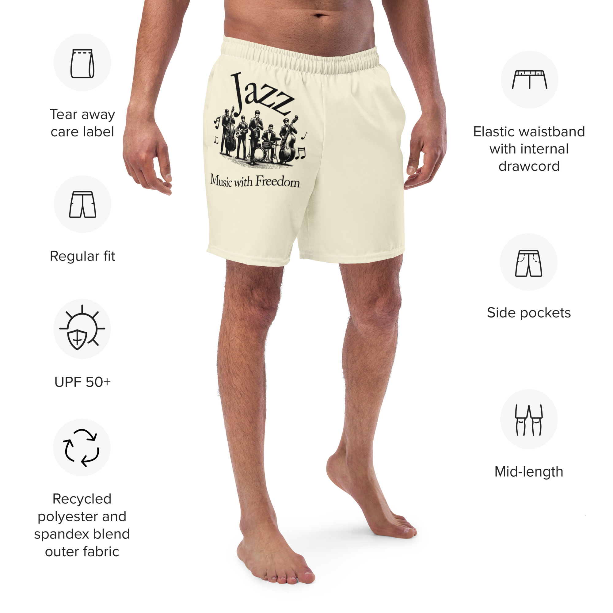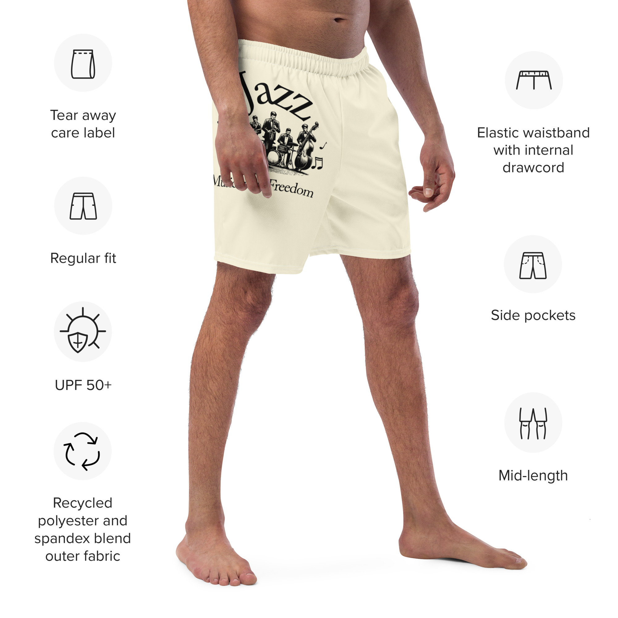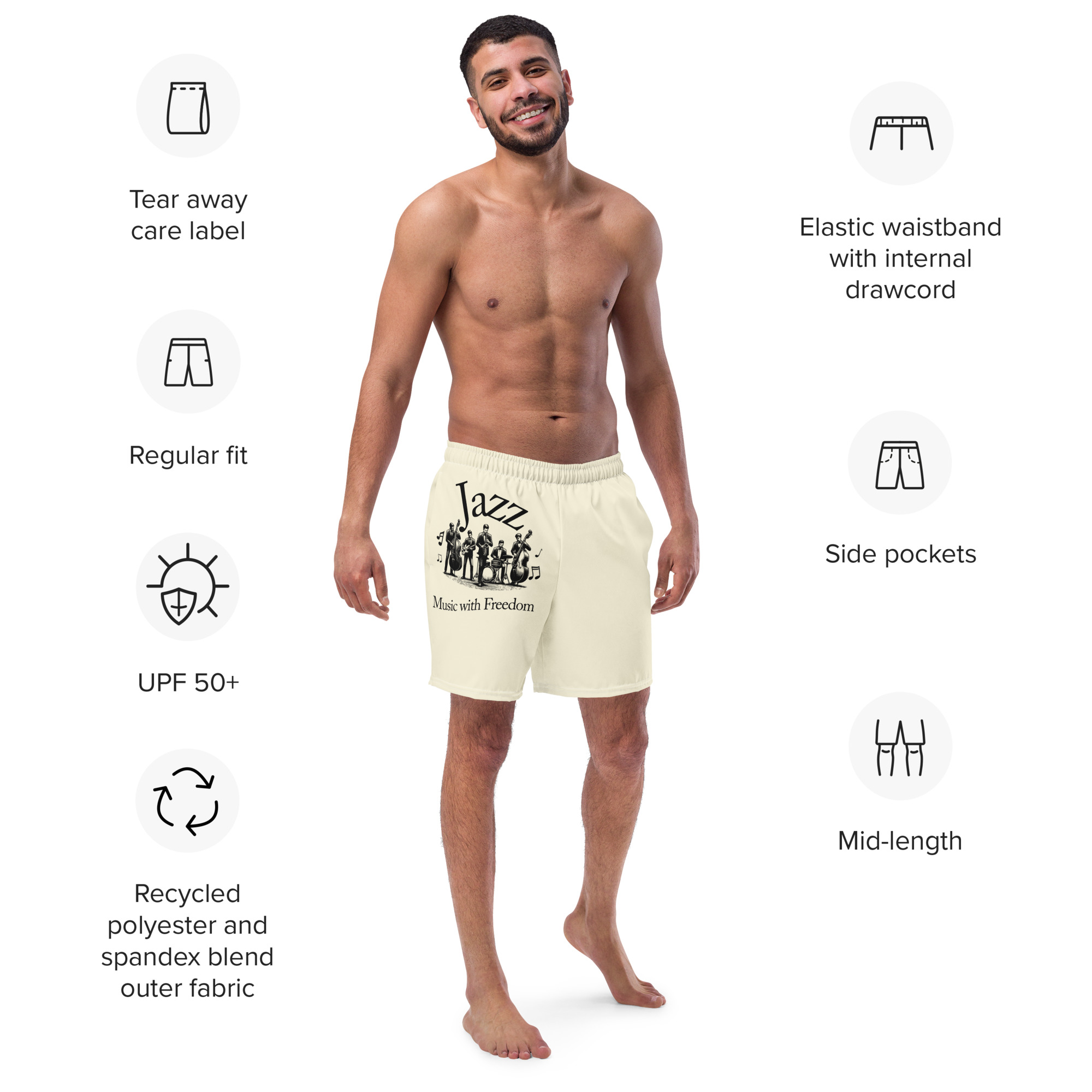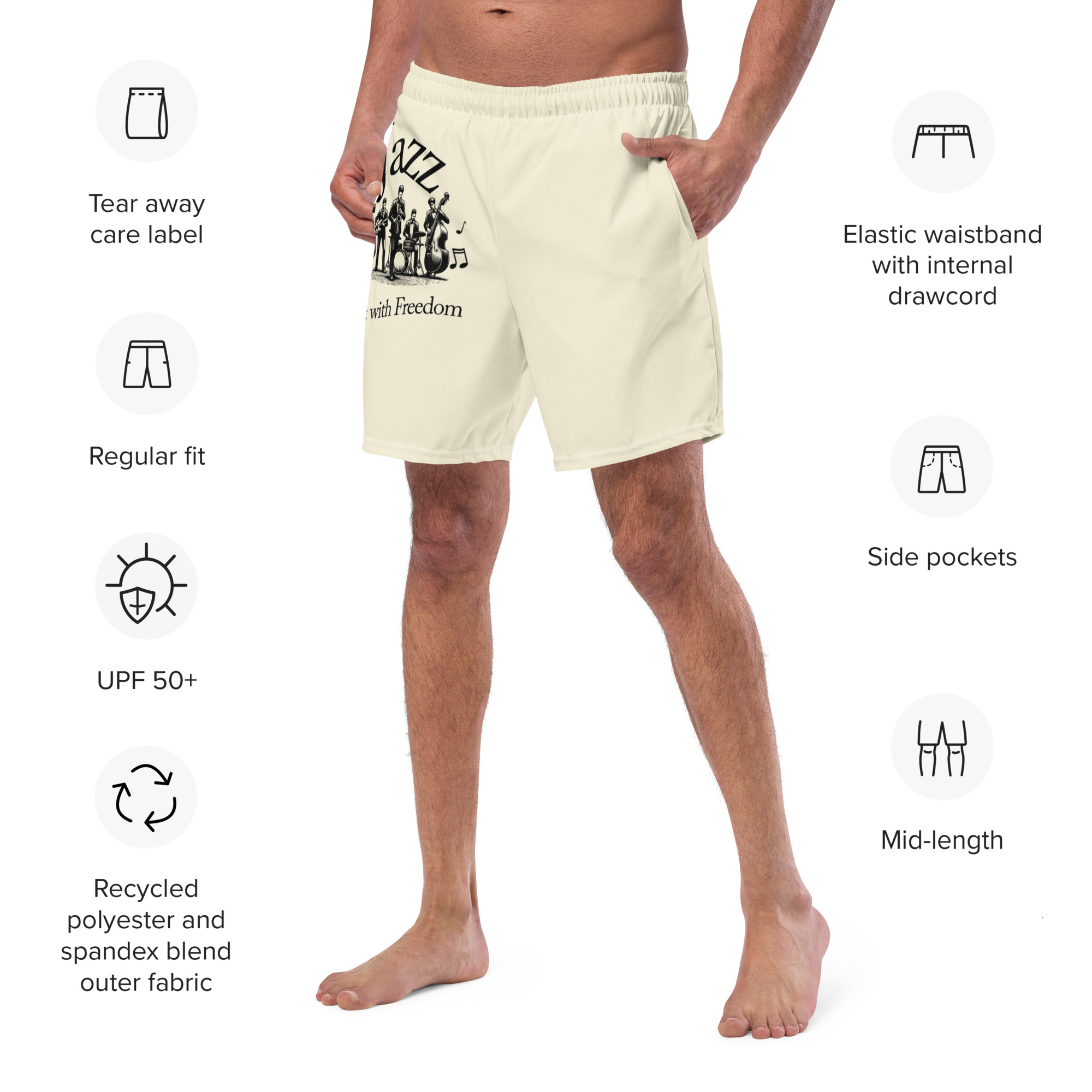 Perfect for a hot summer day, these Jazz Swim Trunks offer quick-drying, breathable fabric, multiple pockets for essentials, and a silky, anti-chafe inner liner. The elastic waistband with a drawcord provides a secure, flexible fit for all sizes, ensuring comfort and freedom of movement in and out of the water. Grab yours today!