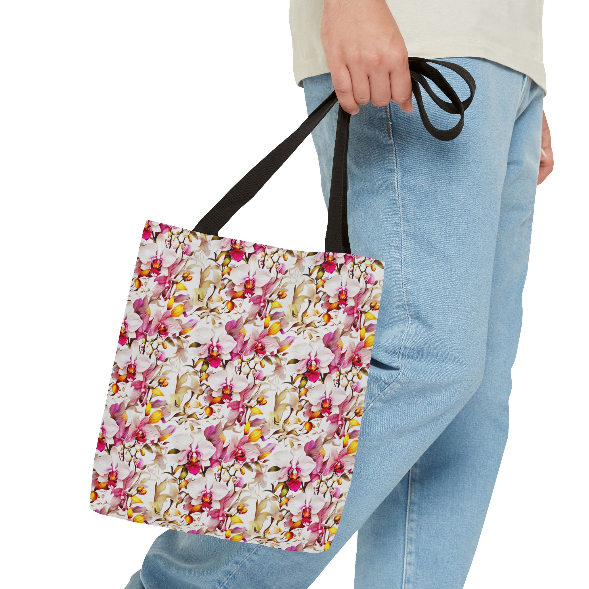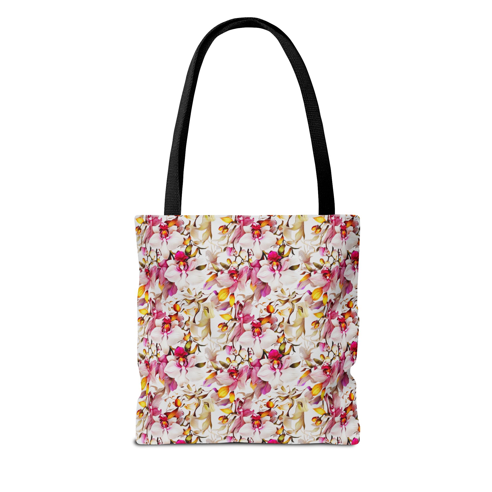With its robust build and user-friendly design, the Pink and Yellow Orchids Tote Bag is ready for daily challenges and remains aesthetically pleasing. A striking orchid pattern in shades of pink and yellow is set against a gentle, neutral background, resulting in a harmonious and sophisticated aesthetic. Its customizable handle colors make this tote bag a perfect choice for bringing a lively and uplifting feel to your regular schedule or informal get-togethers.