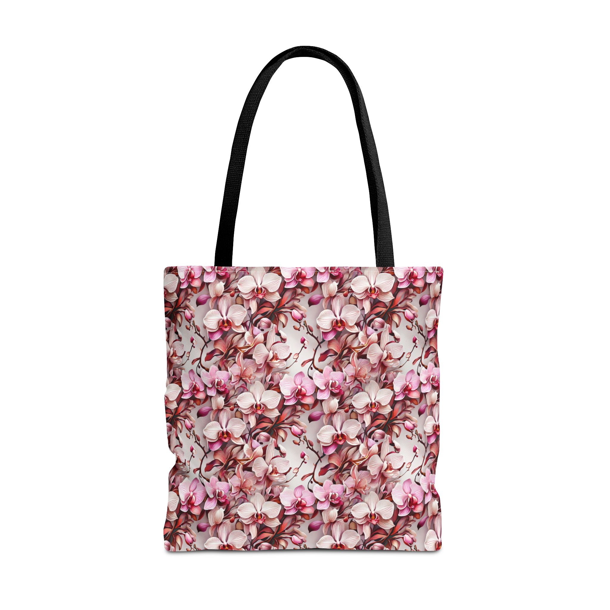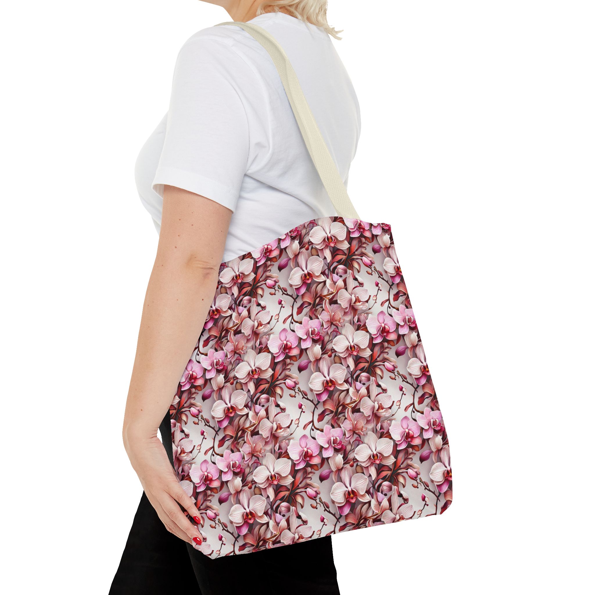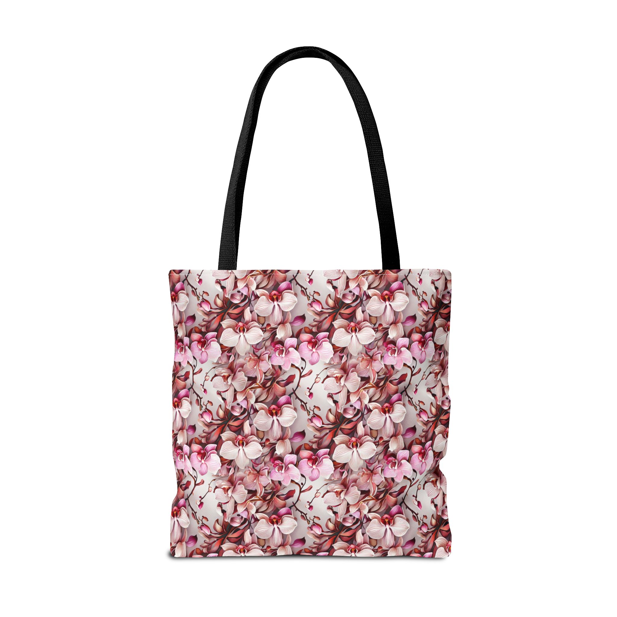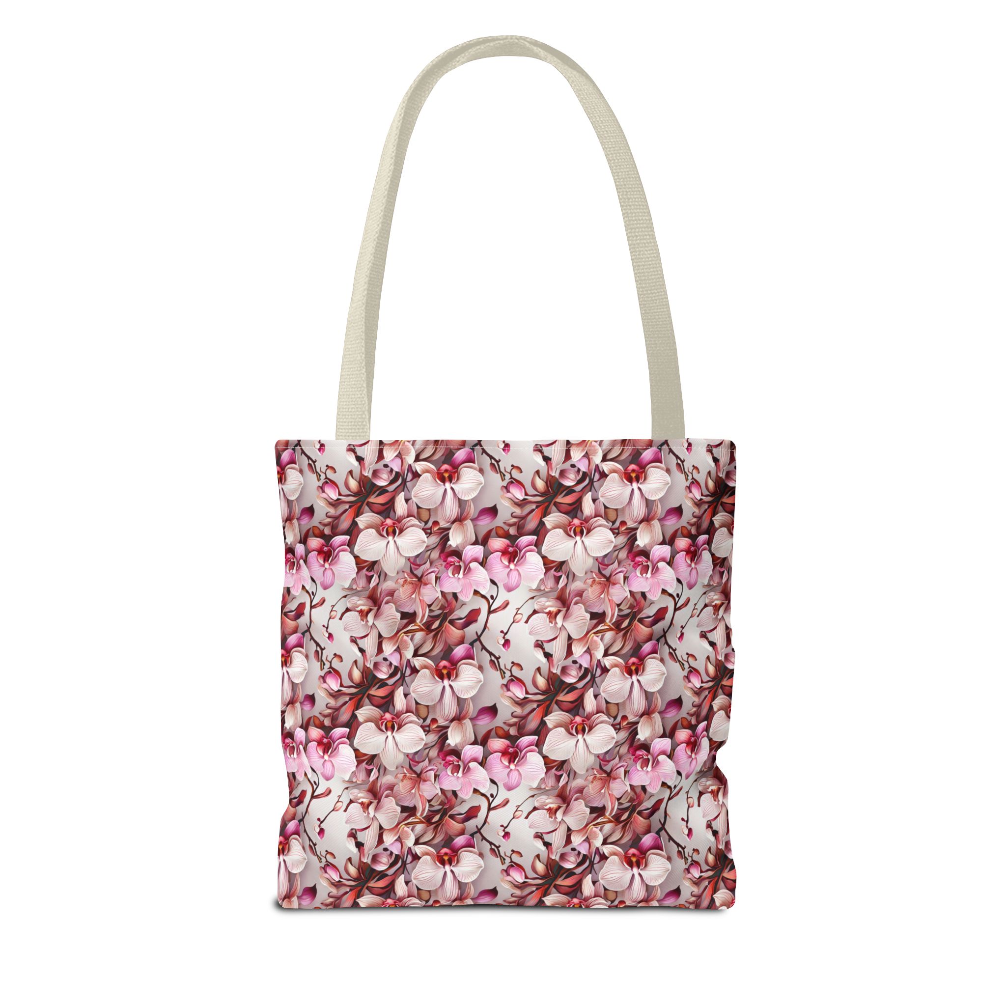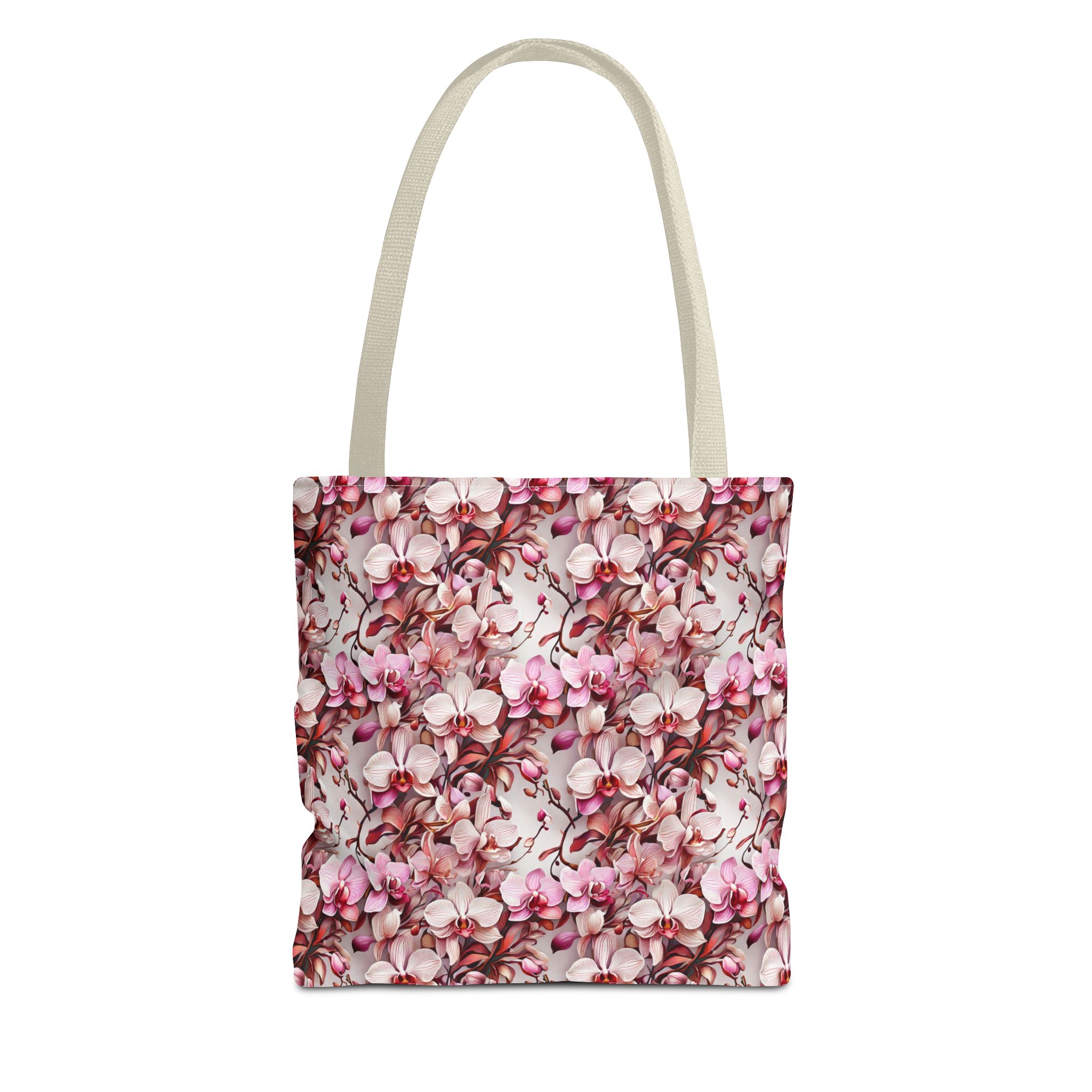 The Pink Orchids Tote Bag is an ideal fusion of grace and utility, enhancing your daily belongings. Crafted with 100% long-lasting spun polyester, this tote boasts a fabric weighing 6.49 oz/yd² (200 g/m²), offering a balance of lightness and durability. Its construction is intended for regular use, preserving the brilliance of its captivating floral print. With three versatile size options, it has generous capacity for your essentials, groceries, or travel goods, striking a balance between utility and aesthetics.