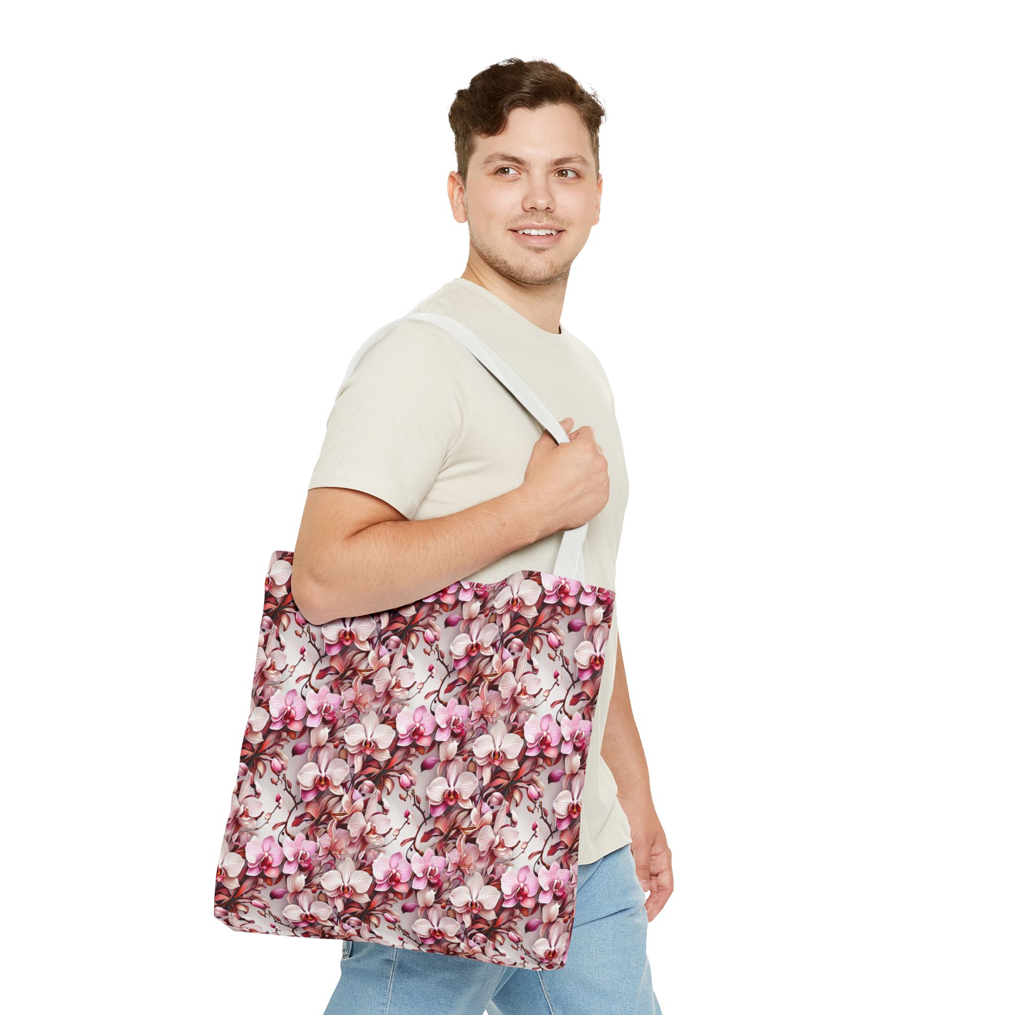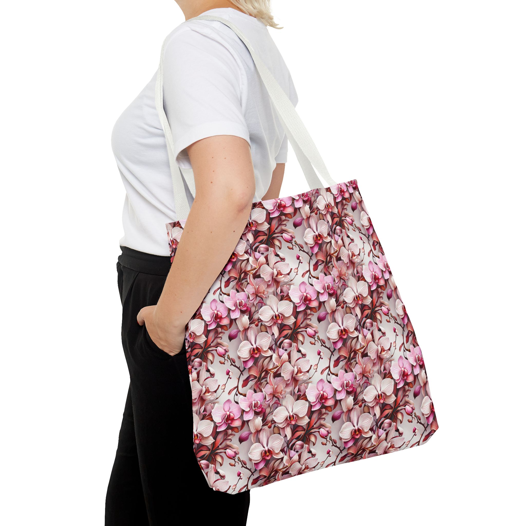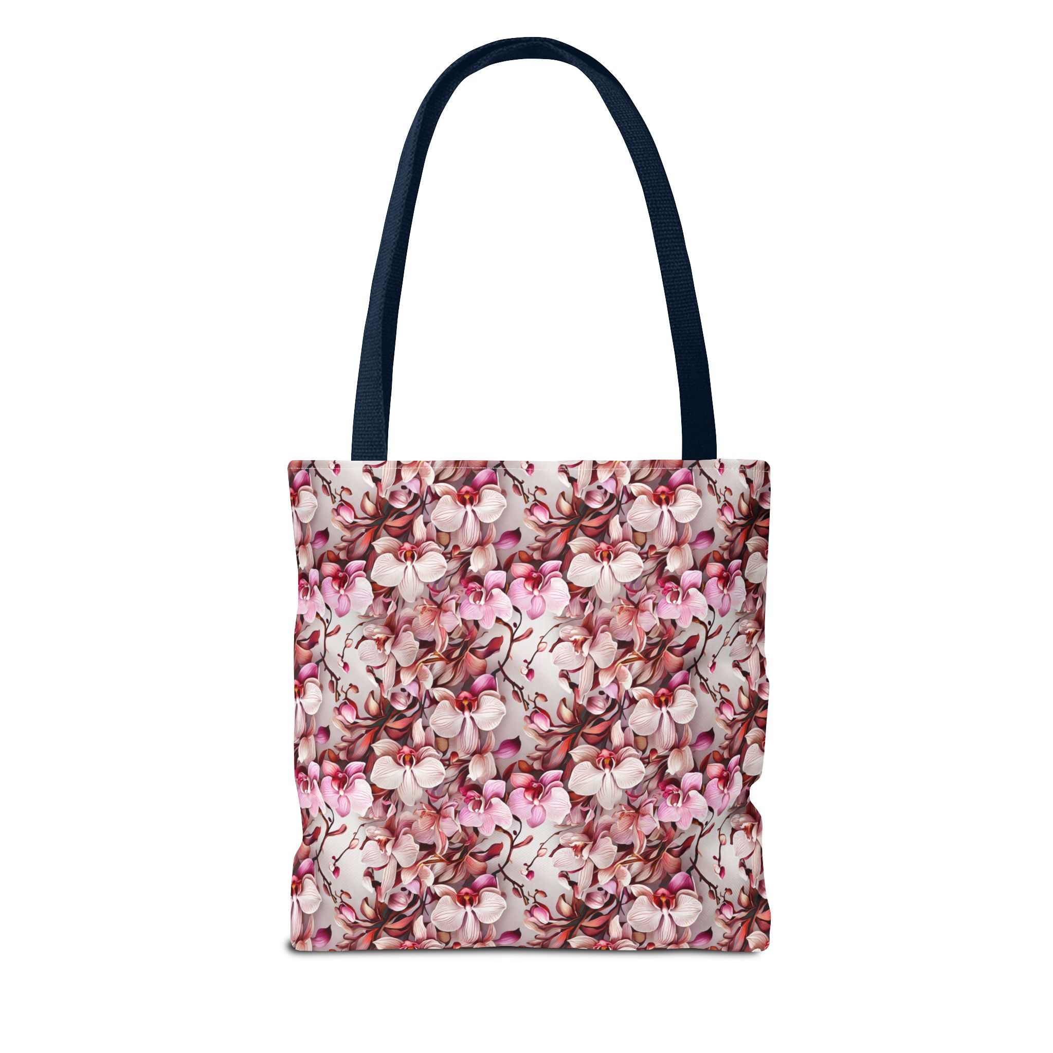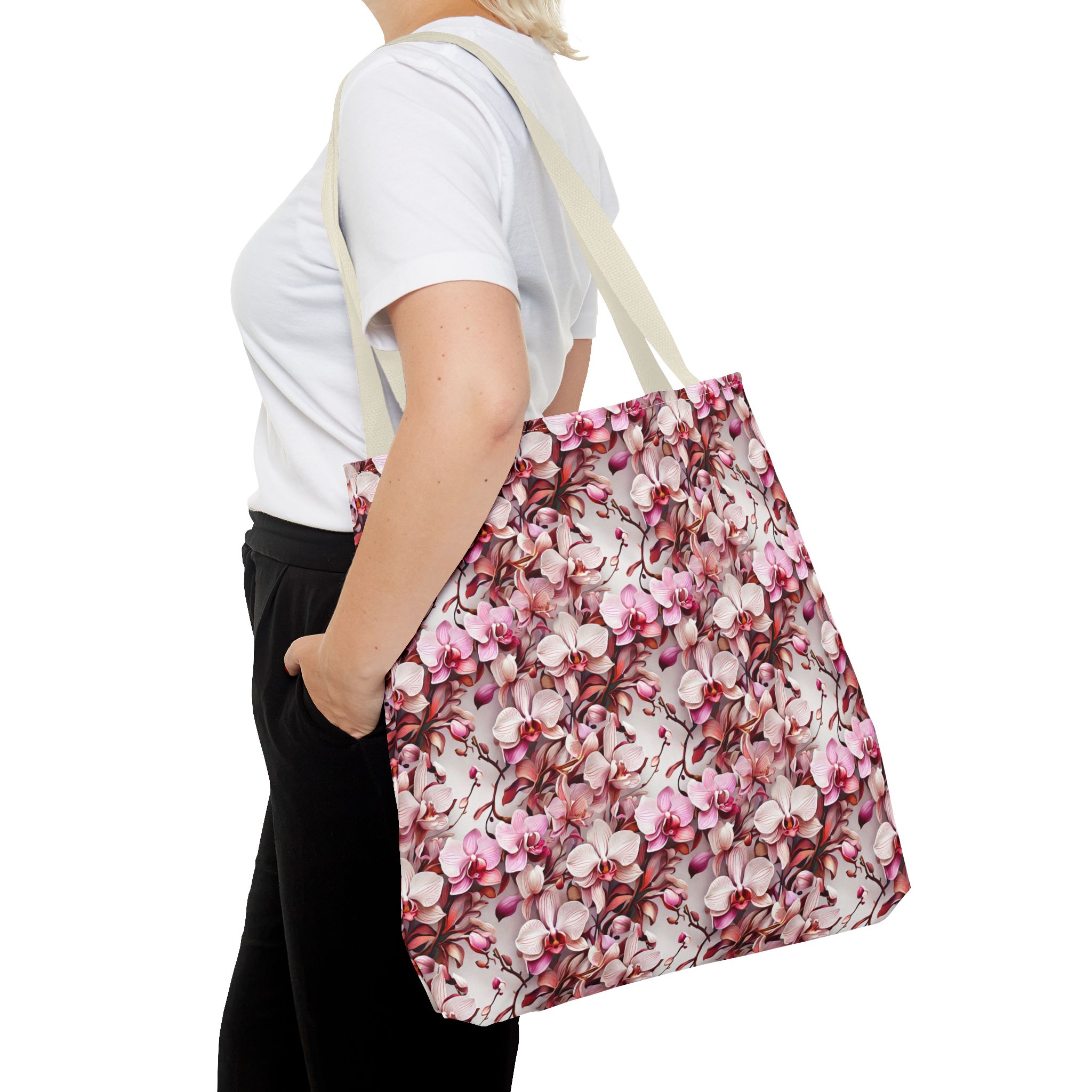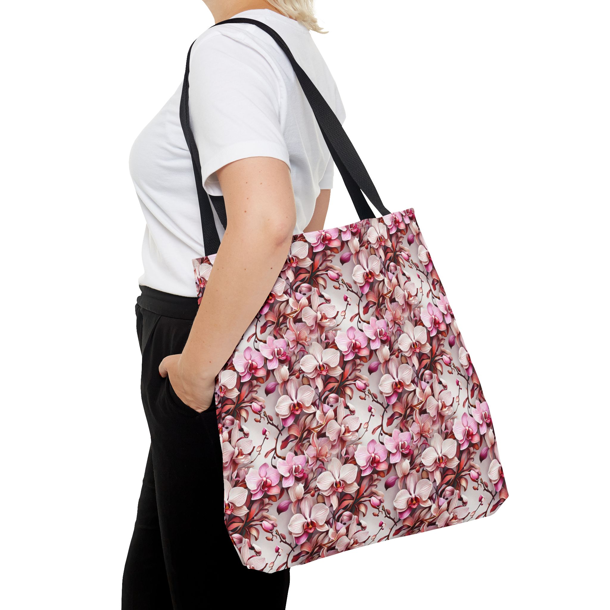 The Pink Orchids Tote Bag is an ideal fusion of grace and utility, enhancing your daily belongings. Crafted with 100% long-lasting spun polyester, this tote boasts a fabric weighing 6.49 oz/yd² (200 g/m²), offering a balance of lightness and durability. Its construction is intended for regular use, preserving the brilliance of its captivating floral print. With three versatile size options, it has generous capacity for your essentials, groceries, or travel goods, striking a balance between utility and aesthetics.