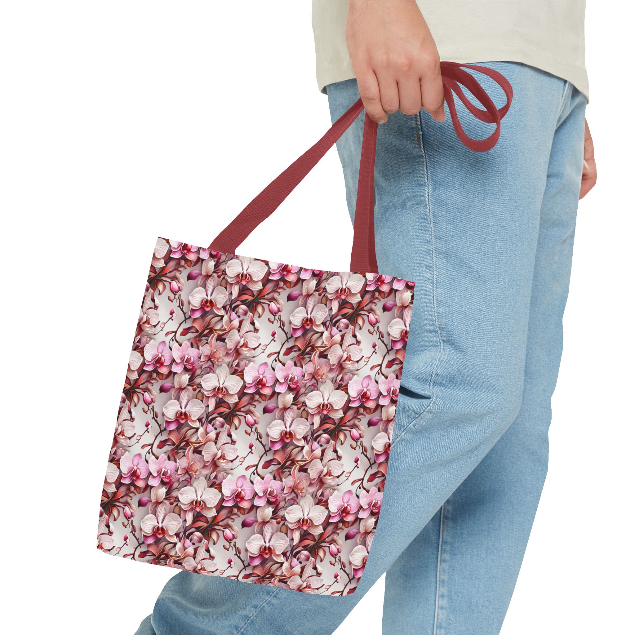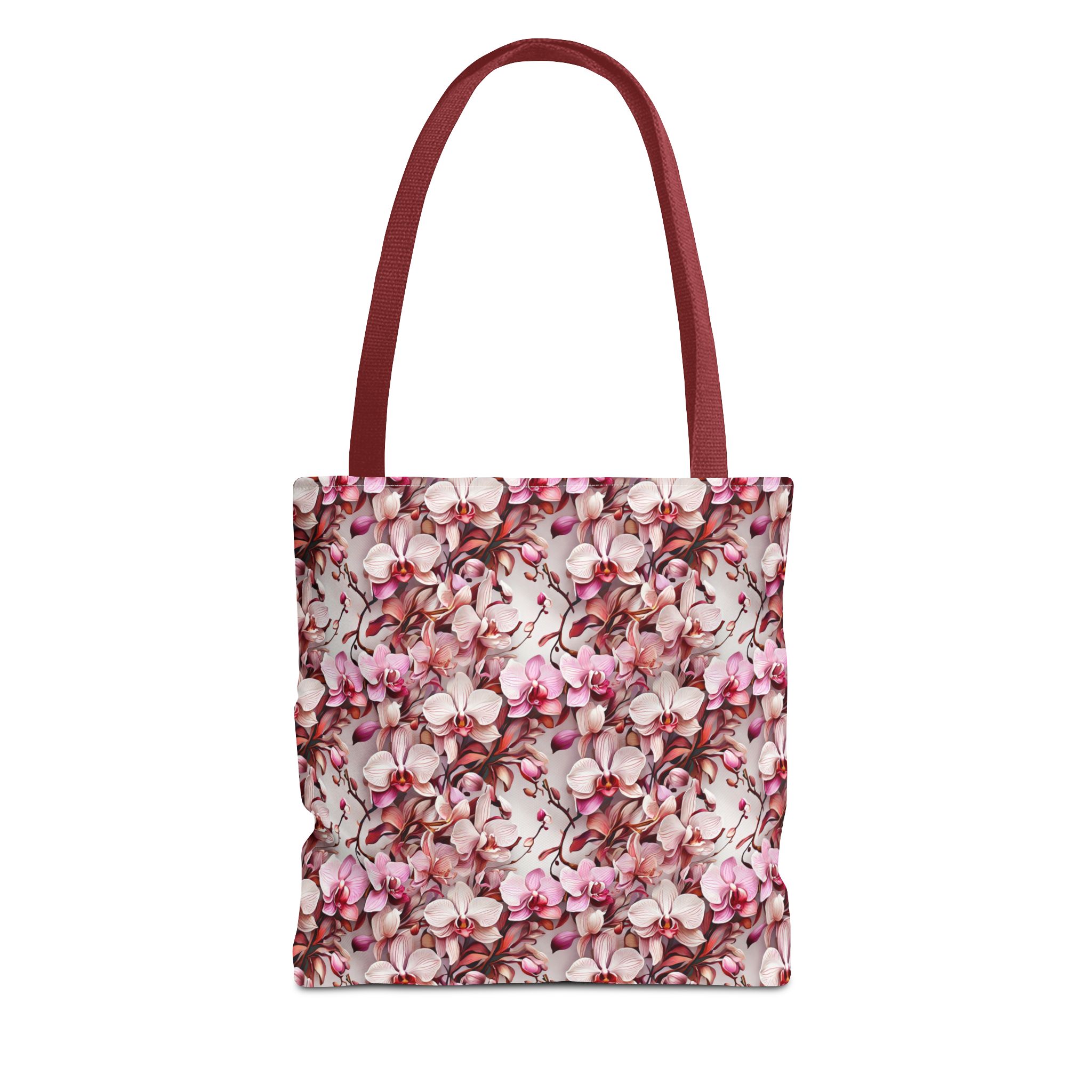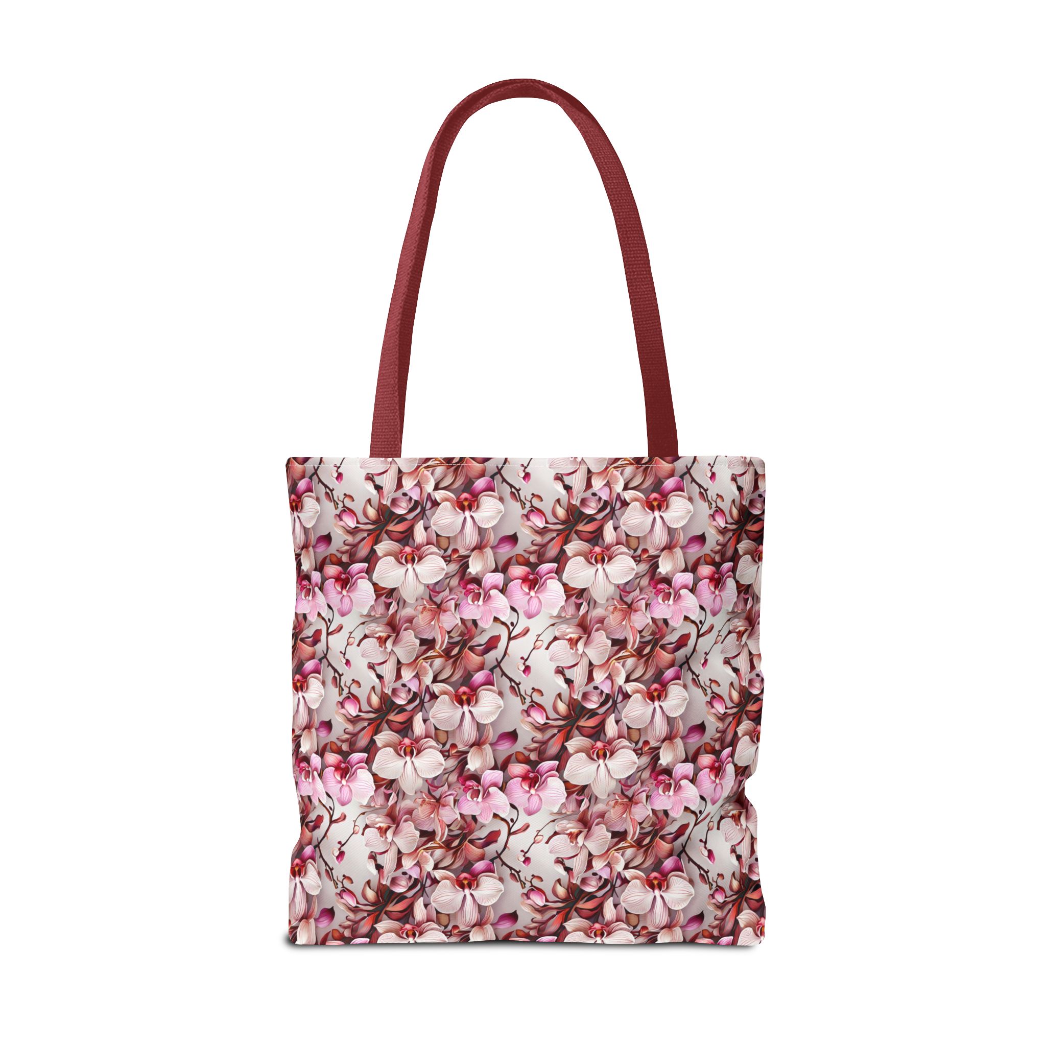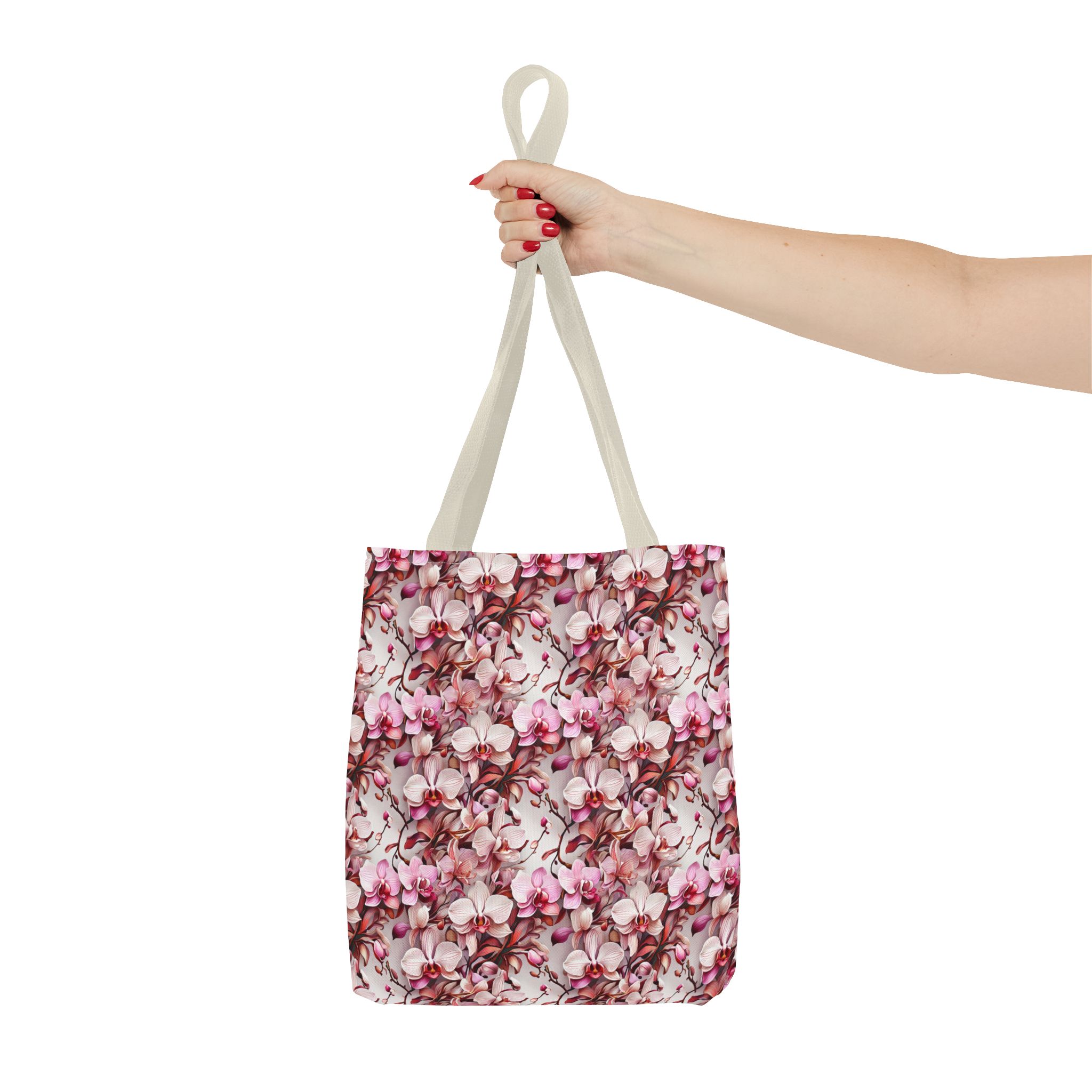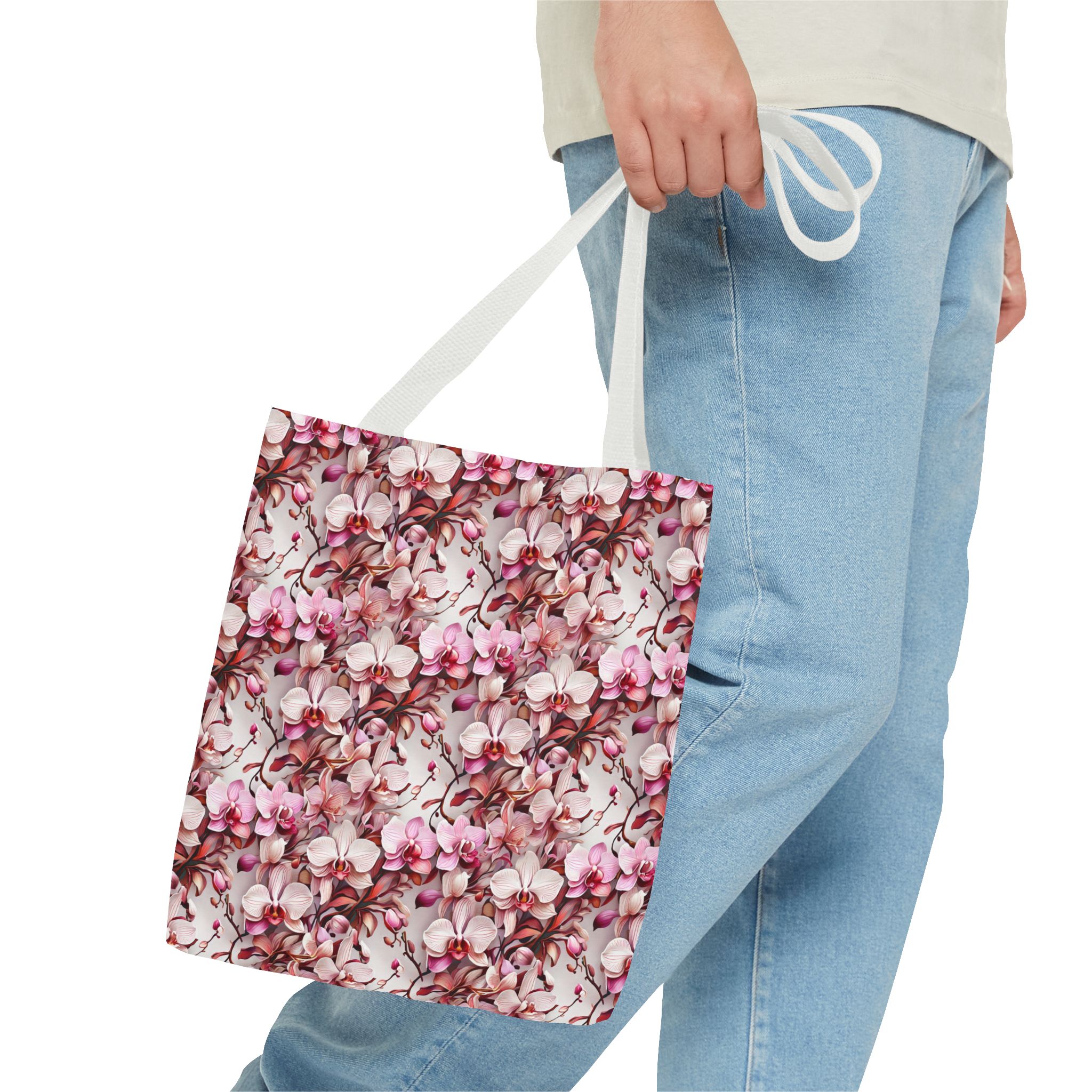 The Pink Orchids Tote Bag is an ideal fusion of grace and utility, enhancing your daily belongings. Crafted with 100% long-lasting spun polyester, this tote boasts a fabric weighing 6.49 oz/yd² (200 g/m²), offering a balance of lightness and durability. Its construction is intended for regular use, preserving the brilliance of its captivating floral print. With three versatile size options, it has generous capacity for your essentials, groceries, or travel goods, striking a balance between utility and aesthetics.