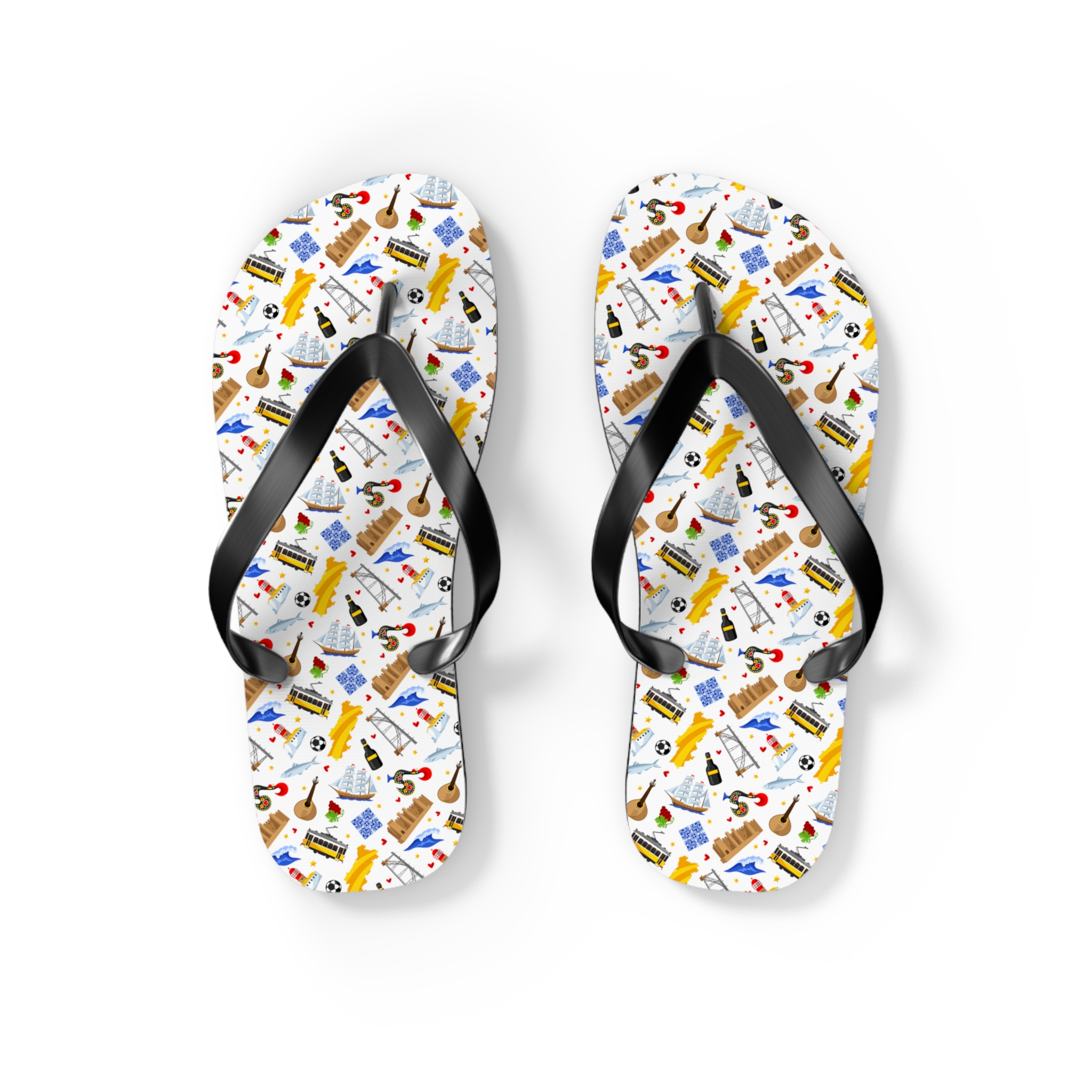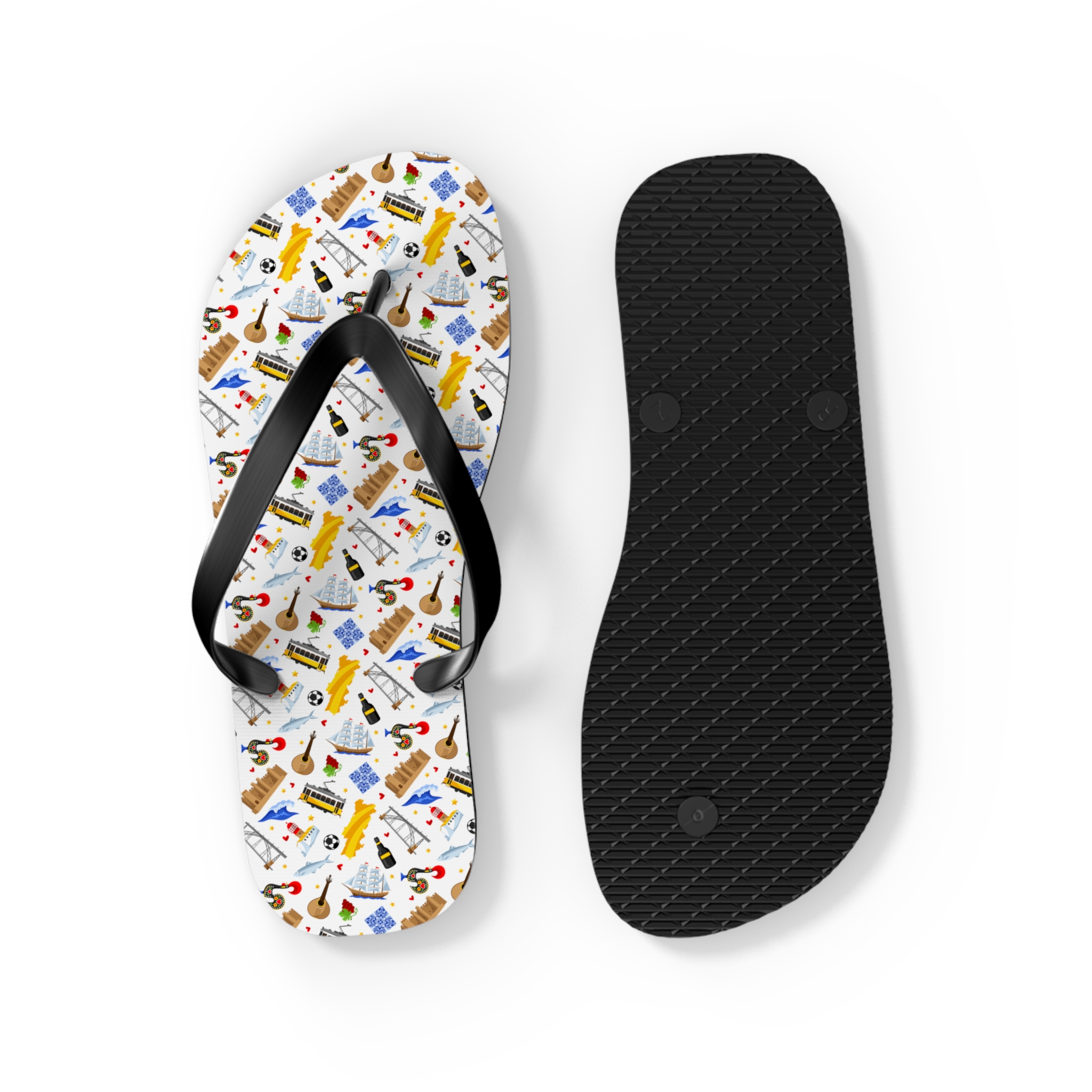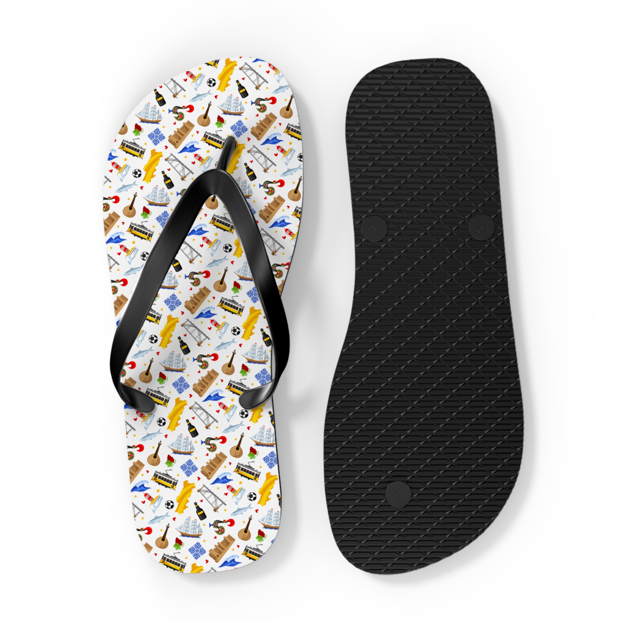 Showcase the lively essence of Portugal with our Portuguese Symbols White Flip-Flops! Adorned with iconic imagery on a clean white backdrop, these aren’t just any flip-flops – they’re a joyful tribute to summer and heritage.