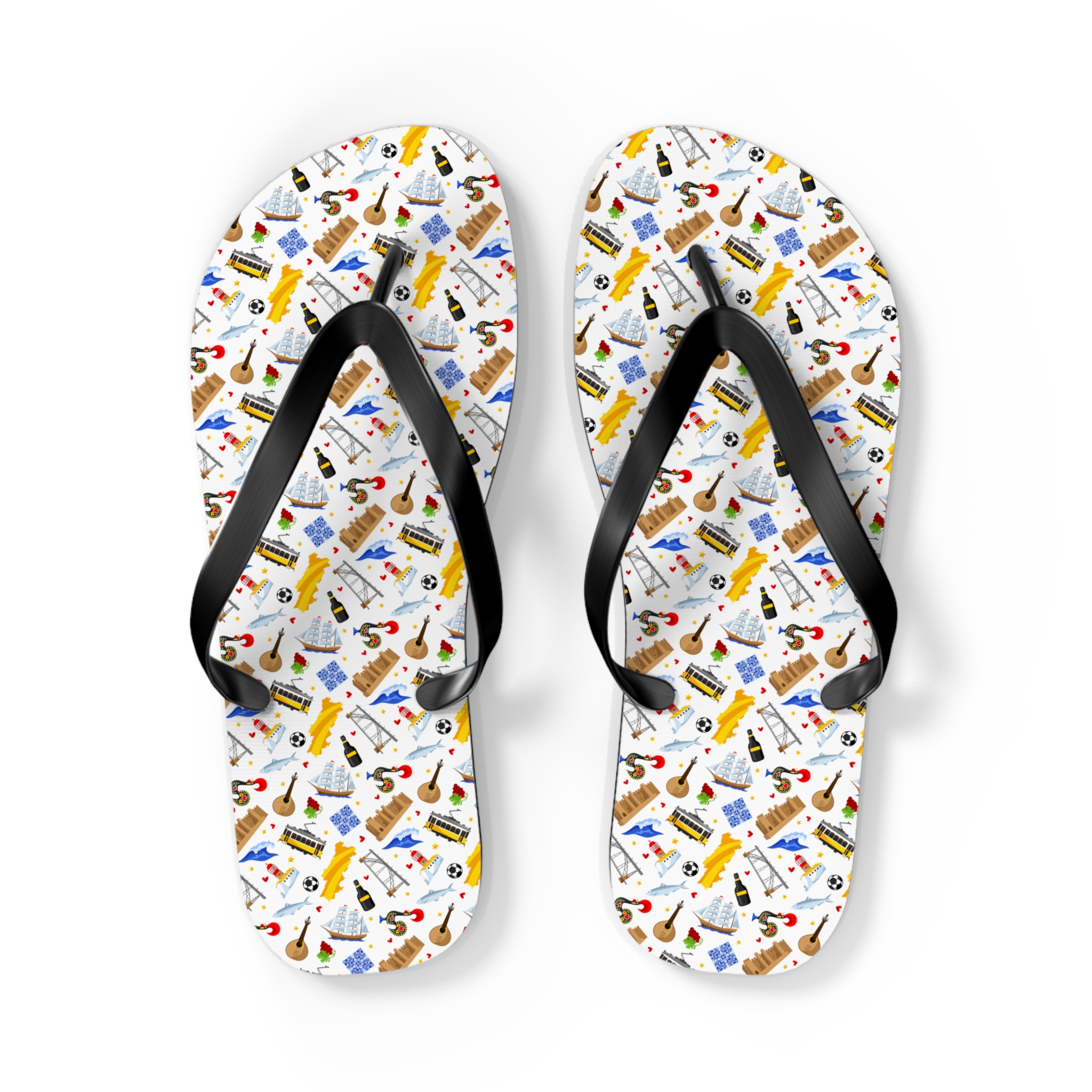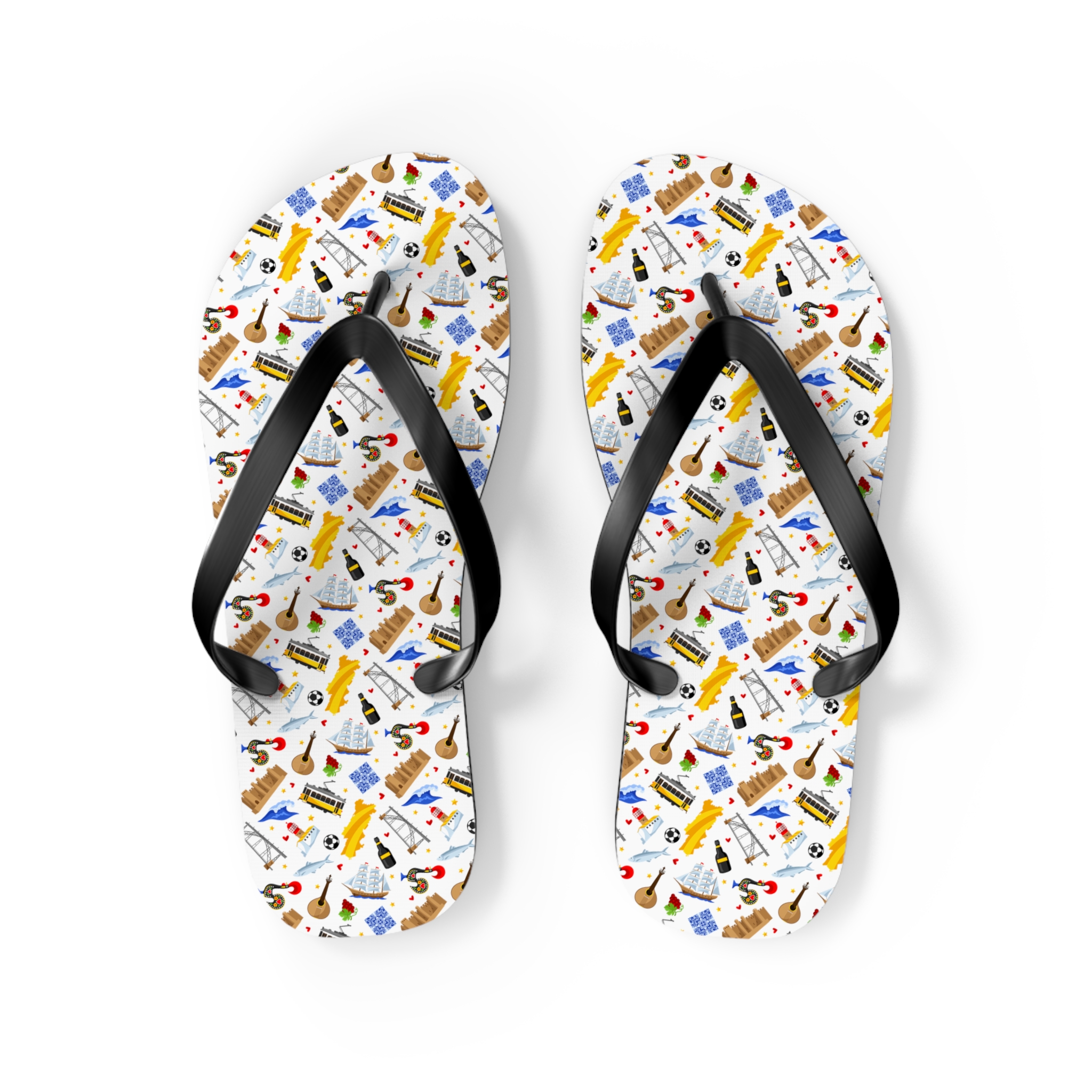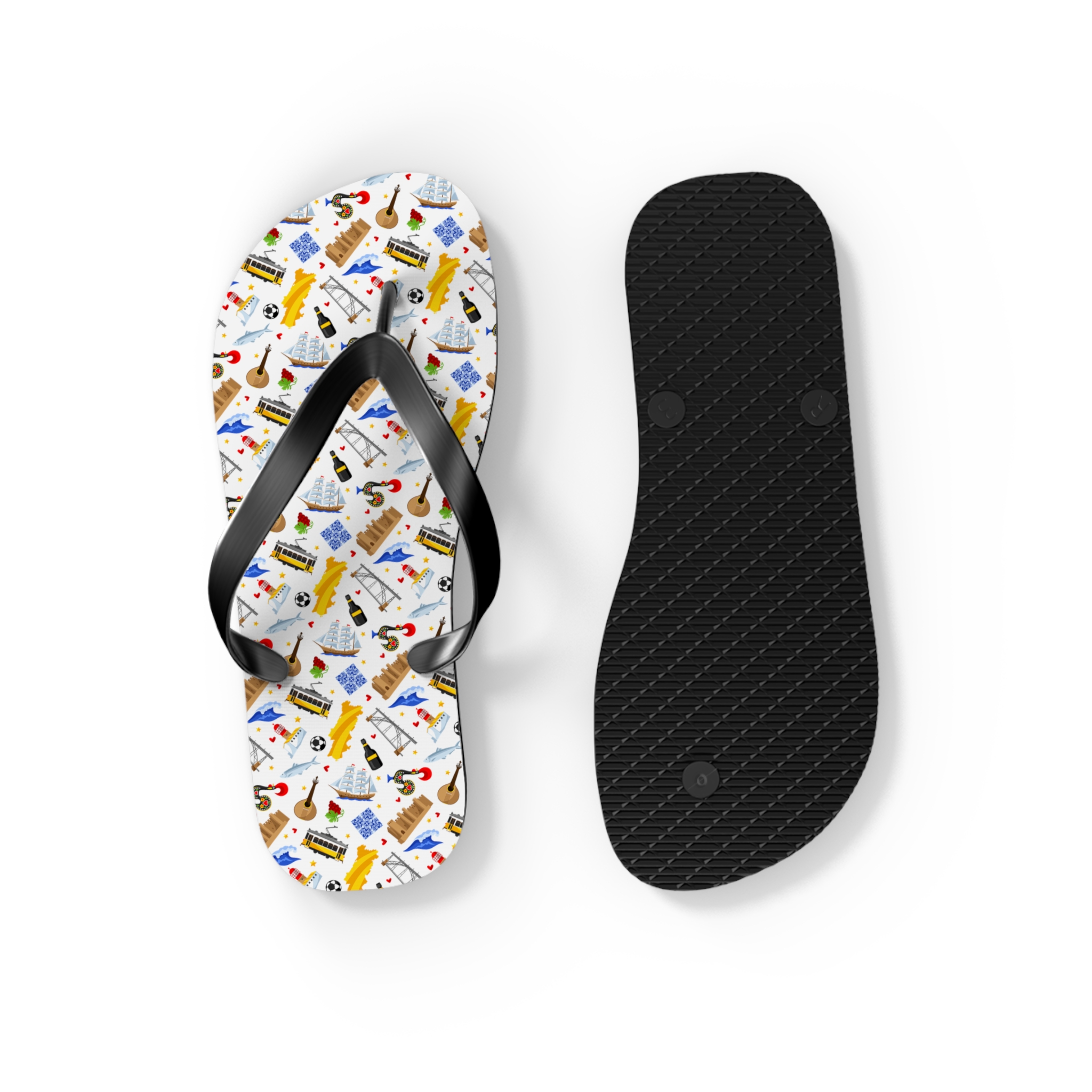 Showcase the lively essence of Portugal with our Portuguese Symbols White Flip-Flops! Adorned with iconic imagery on a clean white backdrop, these aren’t just any flip-flops – they’re a joyful tribute to summer and heritage.