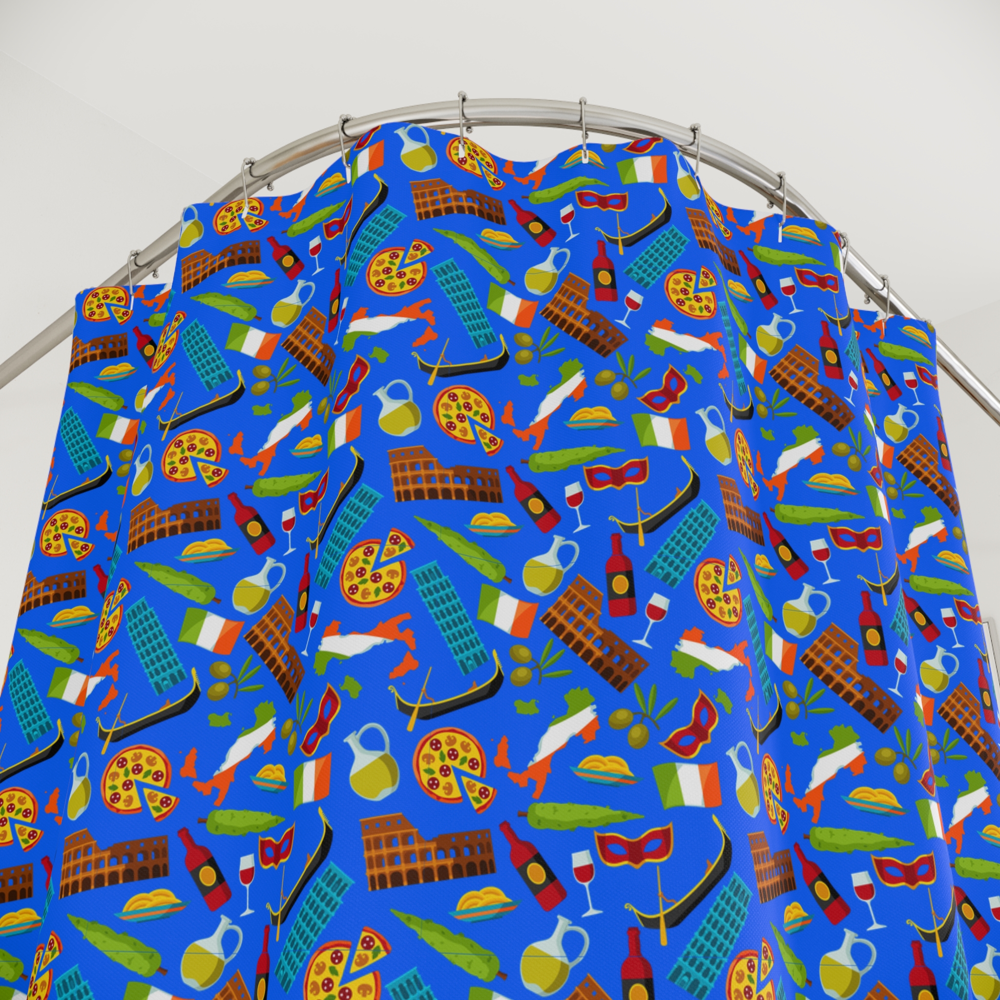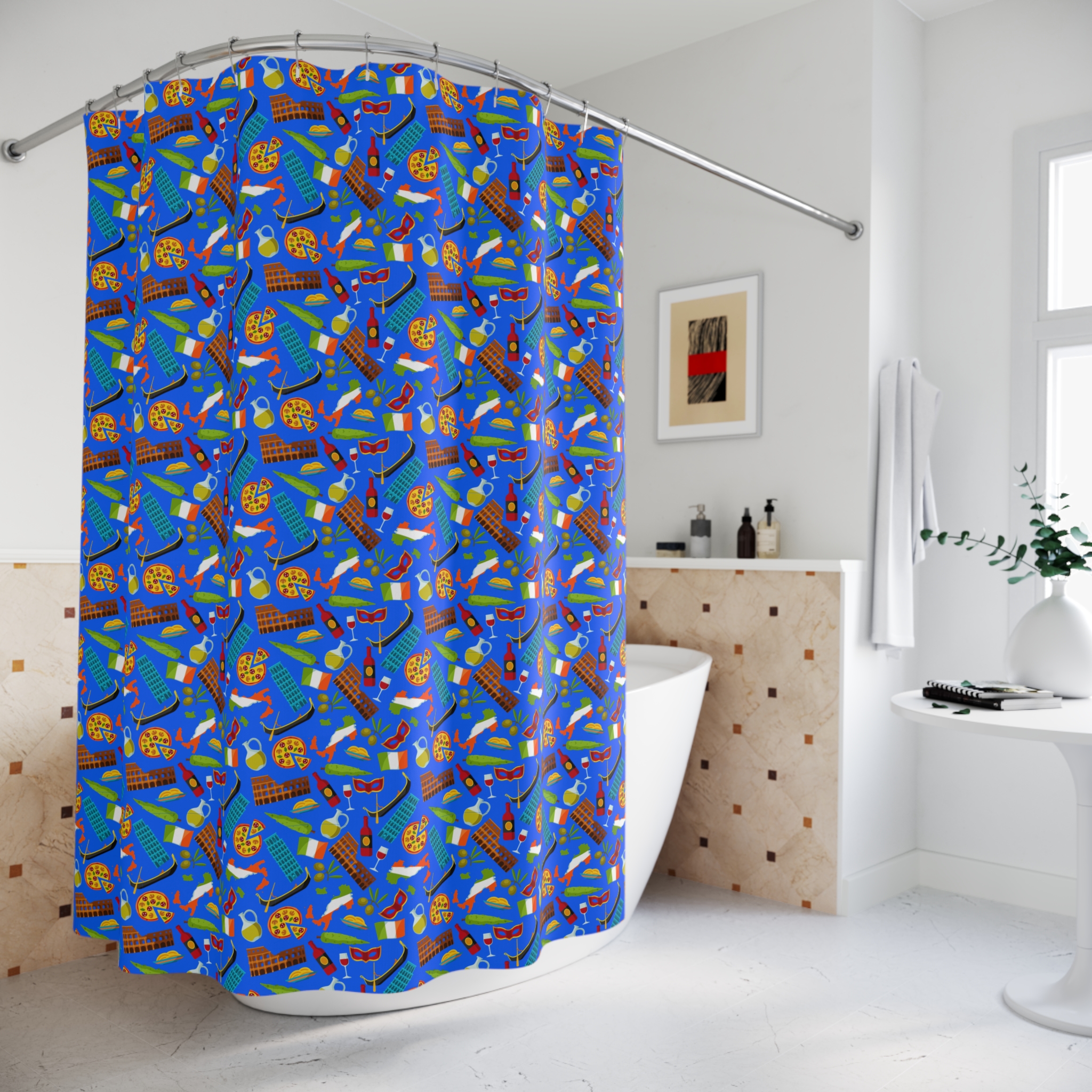 Transform your bathroom into a stylish and culturally rich space with the Symbols of Italian Life Shower Curtain. Its durable polyester material and vibrant design make it a standout addition to any bathroom. Enjoy the perfect combination of practicality and artistic flair, ensuring both comfort and style. Don’t miss the opportunity to enhance your bathroom decor with this beautiful piece of Italian culture.
