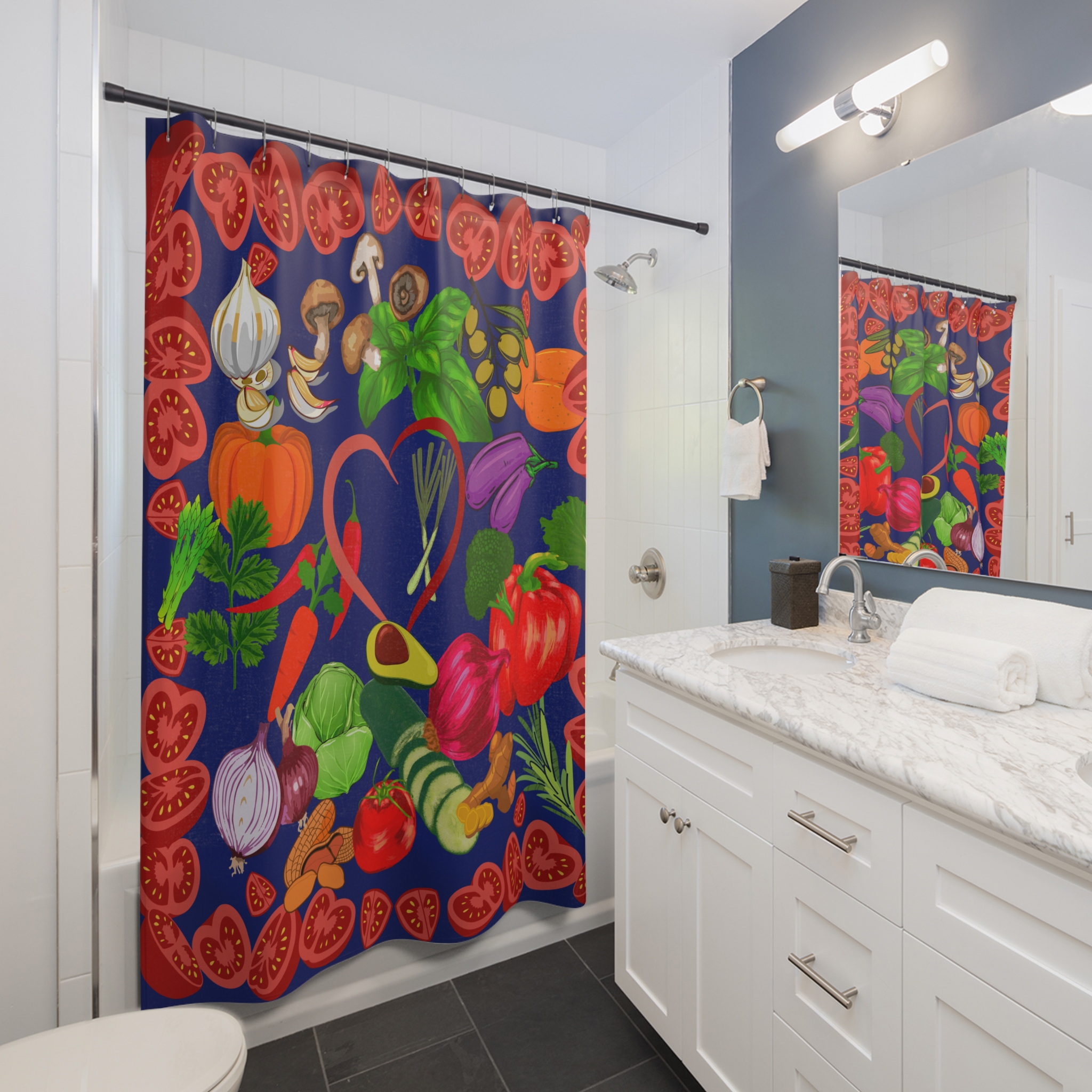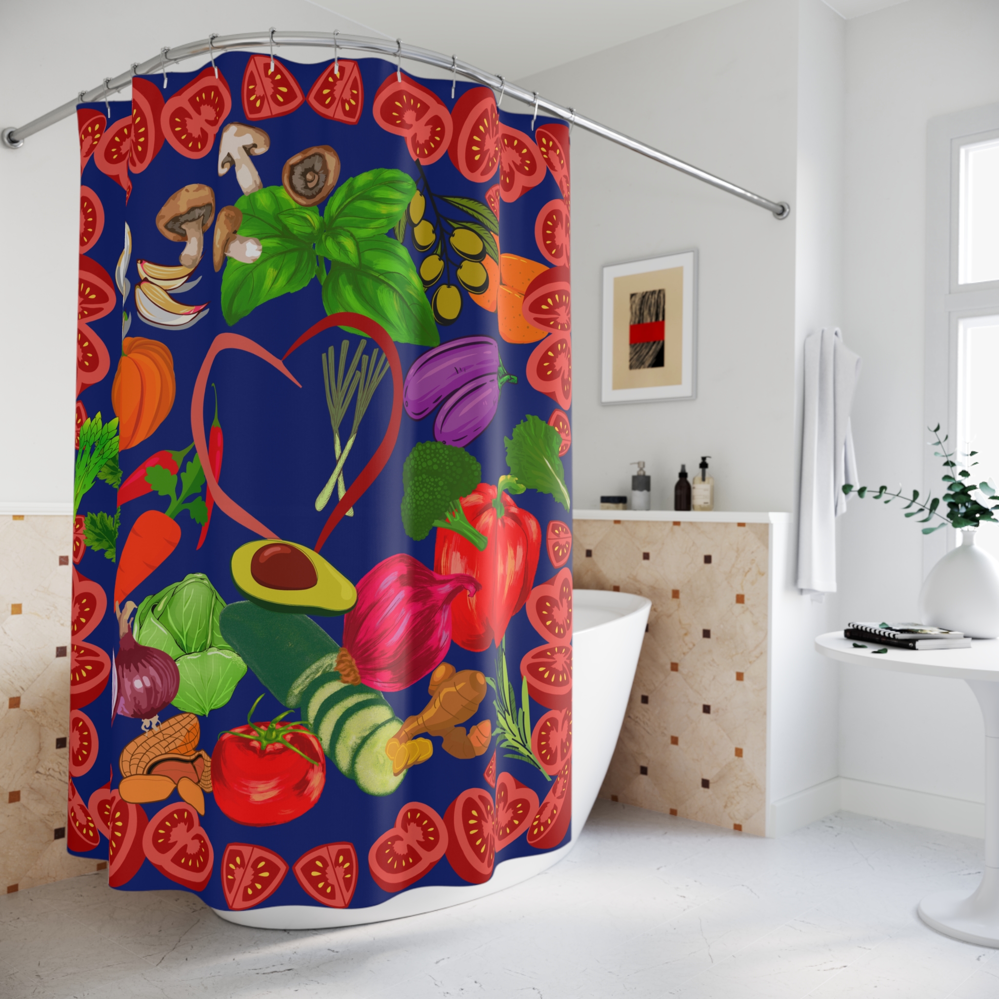 Embrace the abundance of nature with our Vegetable Garden Shower Curtain. Step into a verdant sanctuary and let the vibrant colors of a rich harvest envelop you. The invigorating scent of fresh herbs will transport your senses, transforming your bathroom into a haven of natural beauty. This stylish and functional curtain features a one-sided print with stunning detail, instantly enhancing your space. Crafted from smooth polyester, it’s easy to care for and built to last. It cultivates a serene, organic ambiance, bringing the outdoors in for a daily ritual that feels like a tranquil escape into nature.