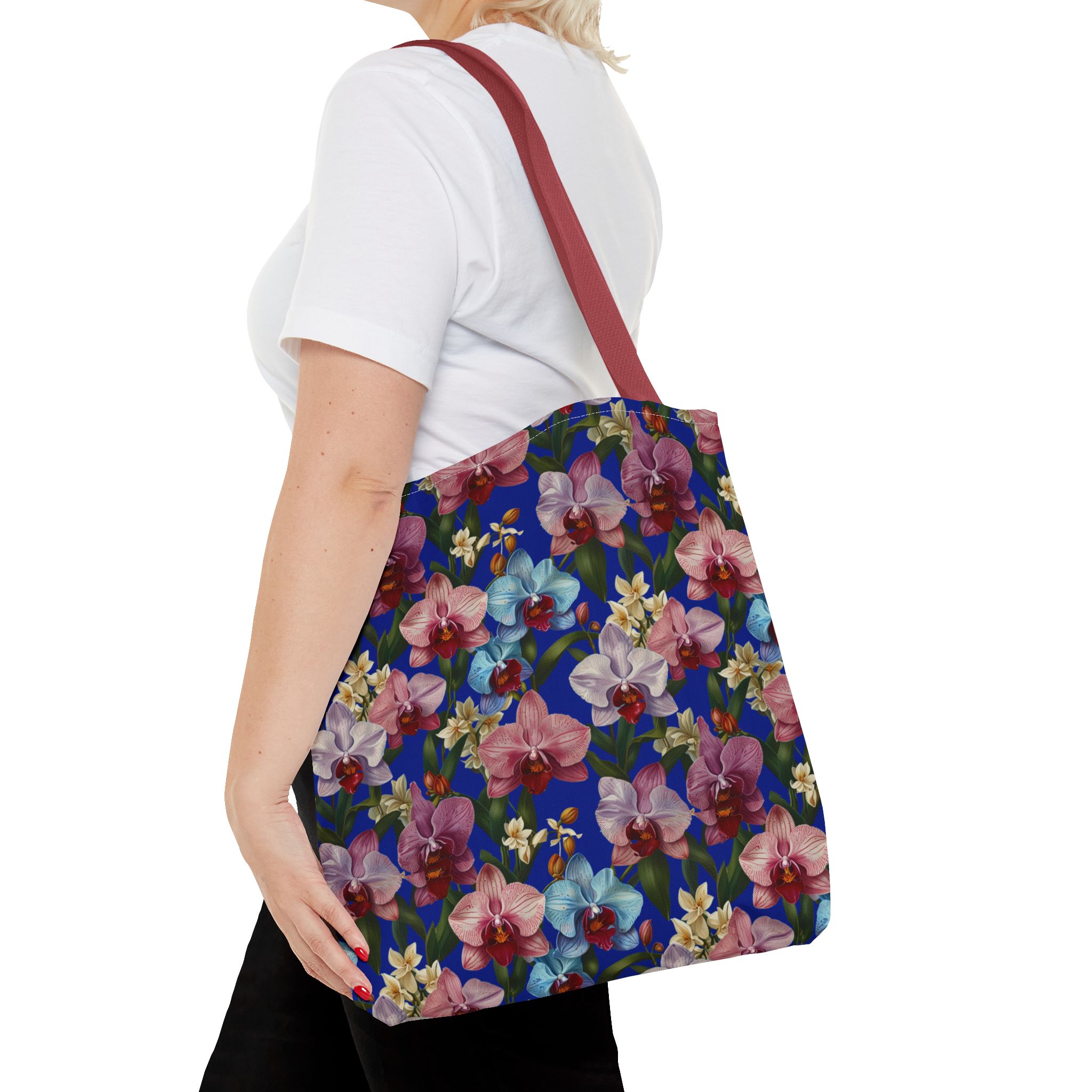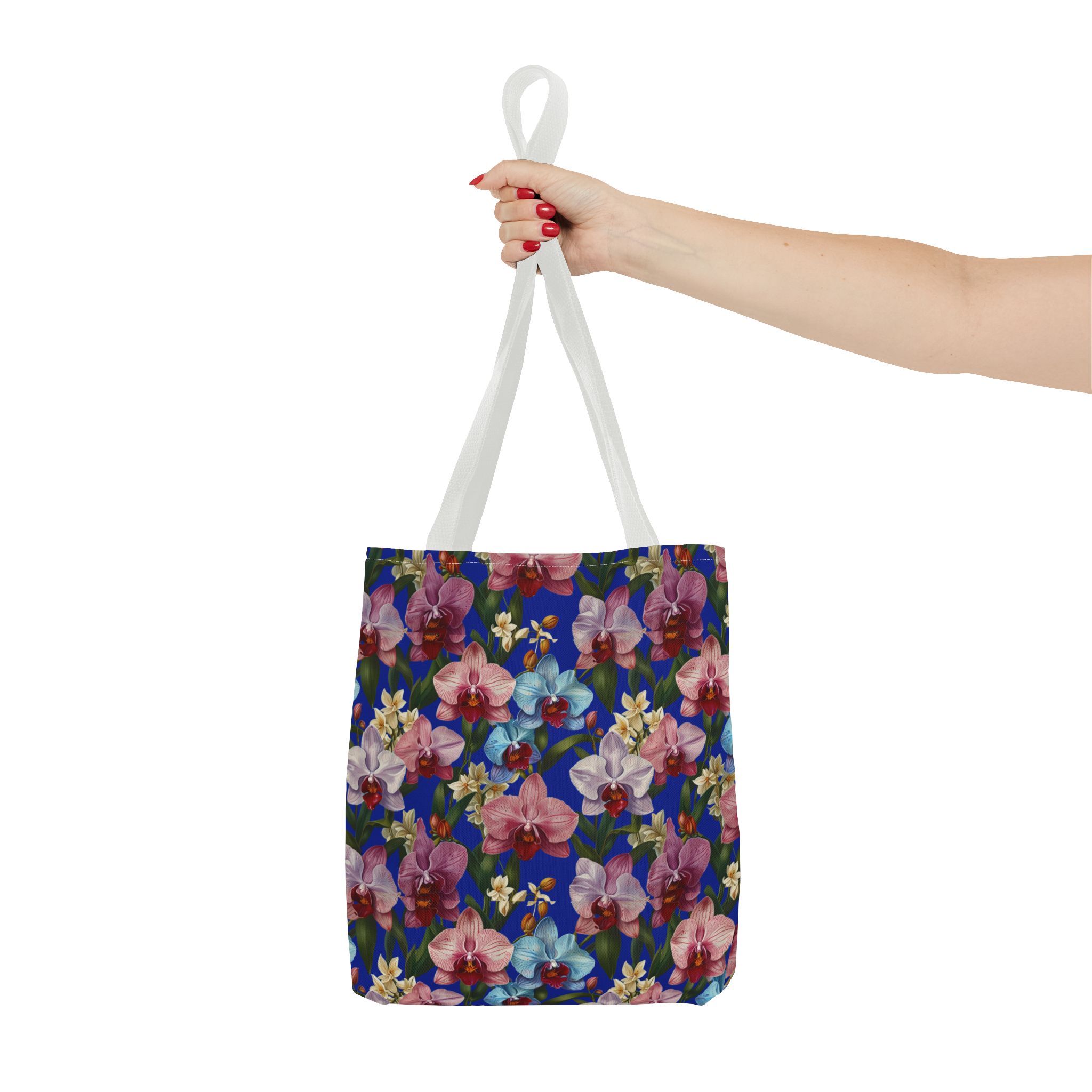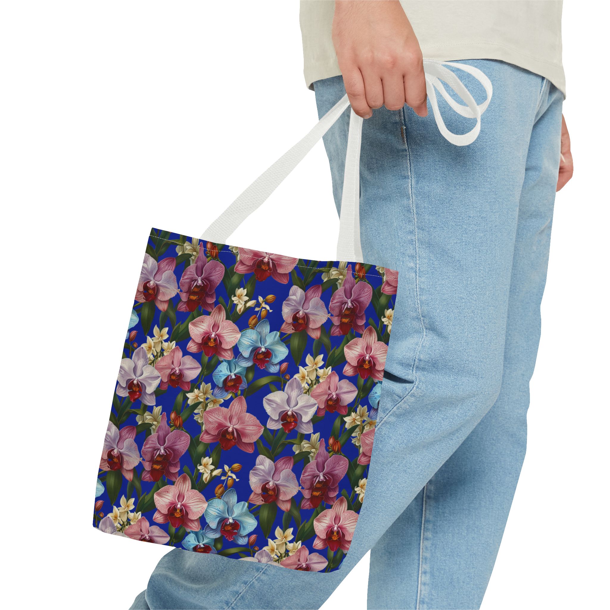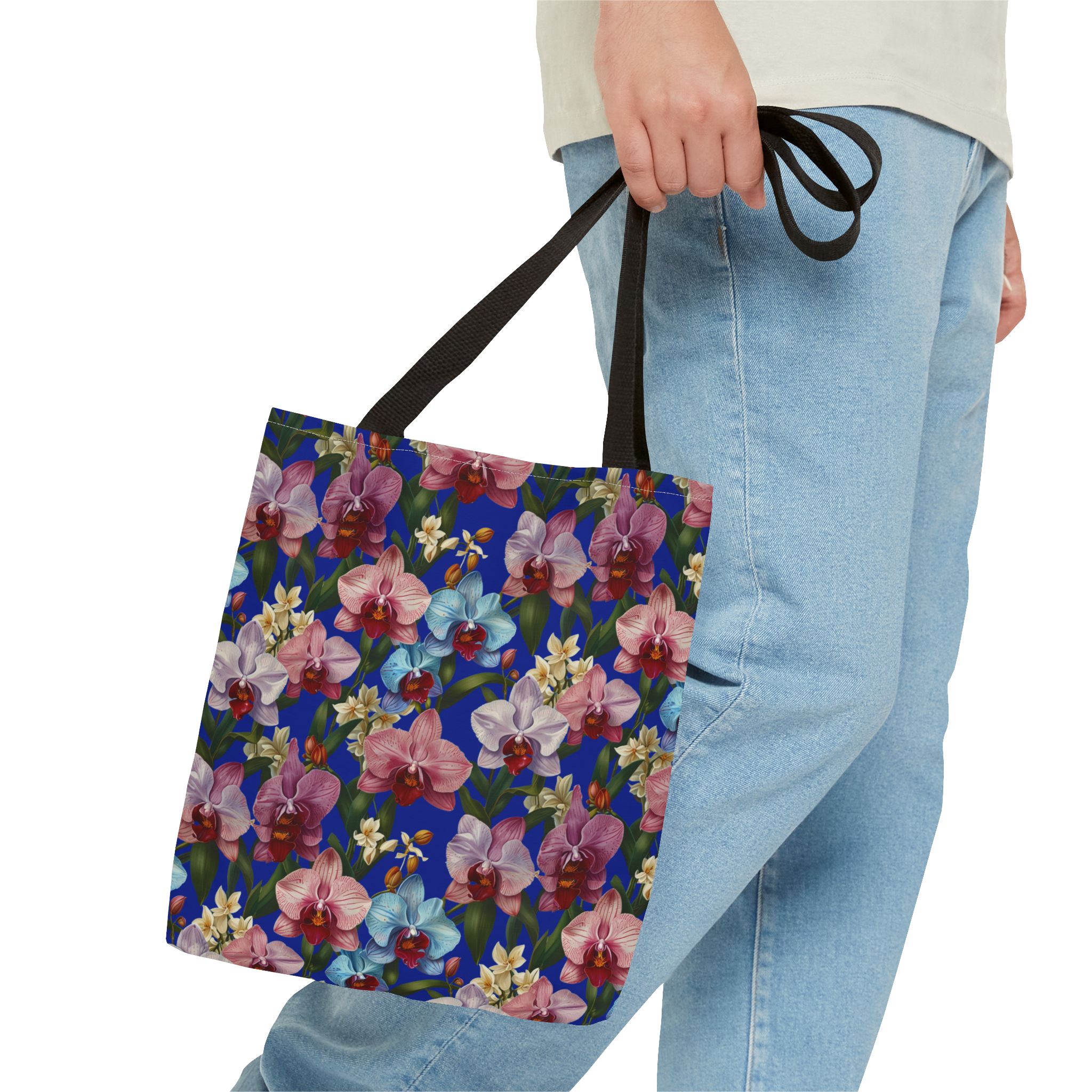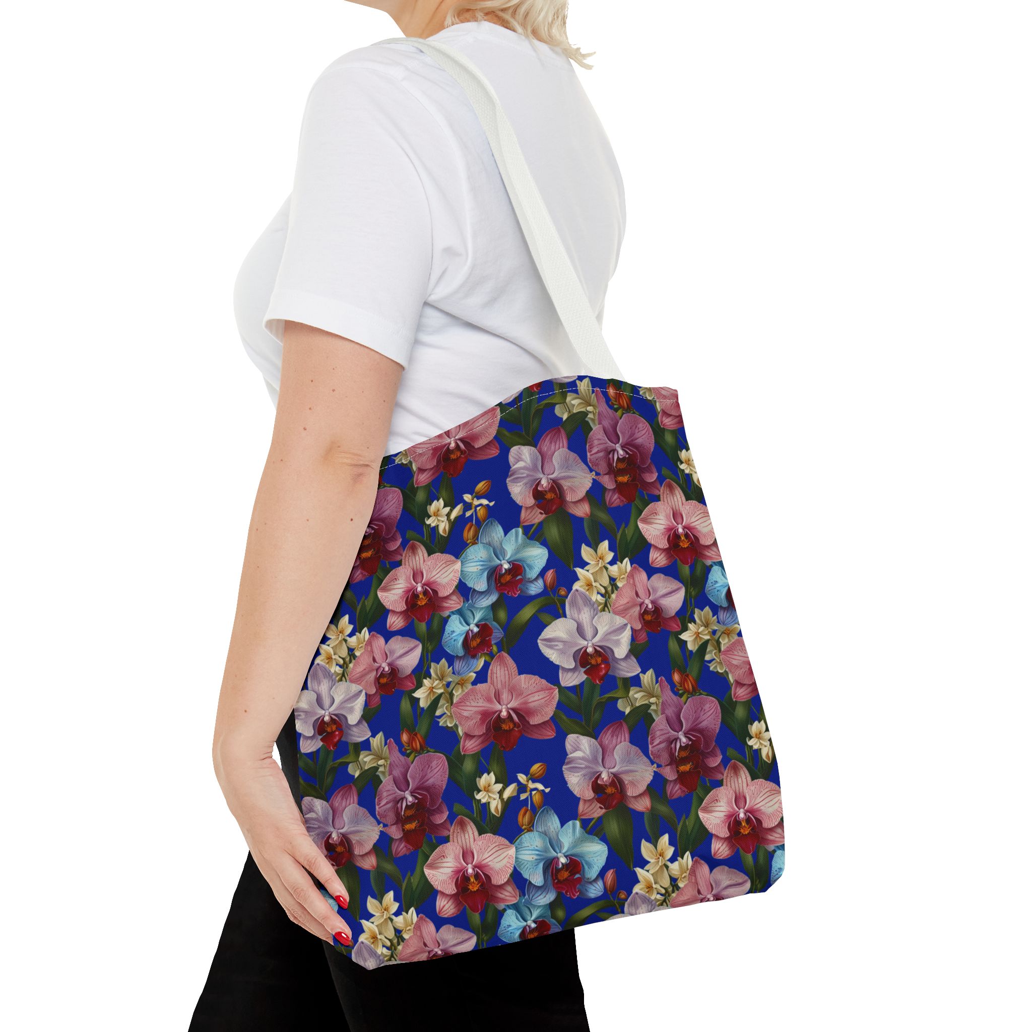 Crafted for both comfort and durability, the cotton webbing straps make carrying effortless all day long. Reinforced double-stitched seams on the Wild Orchids Tote Bag ensure it stands up to consistent use. The eye-catching orchid print on an electric blue background offers a bold, contemporary aesthetic, with a choice of handle colors to add your personal touch. Perfect for daily errands or a sunny getaway, this tote infuses your lifestyle with a vibrant, expressive style.