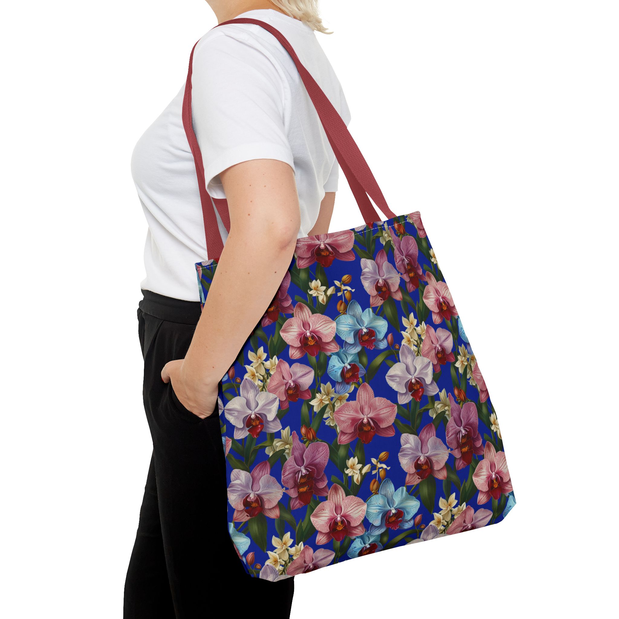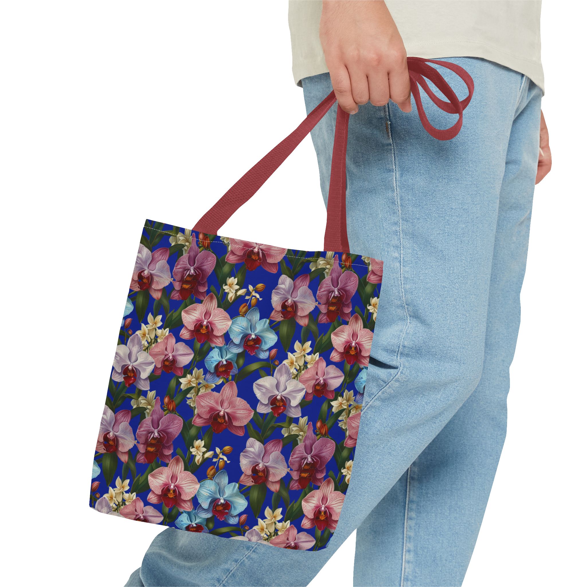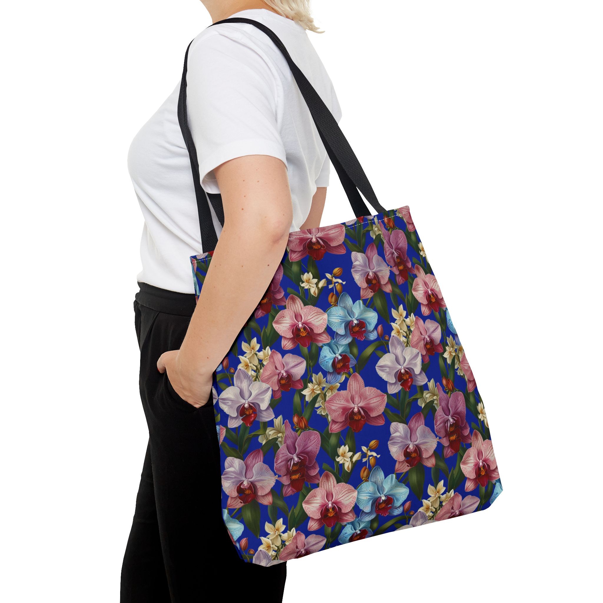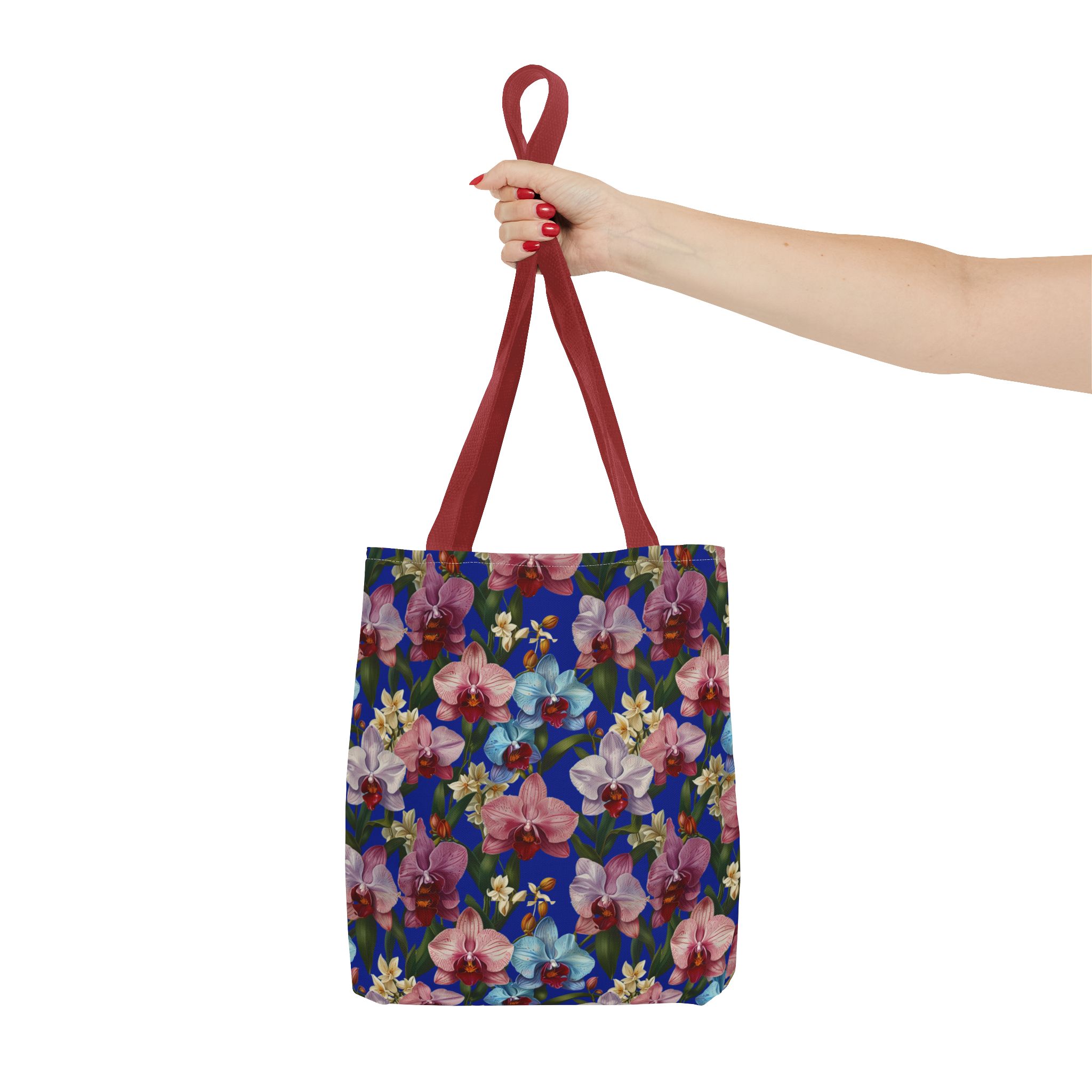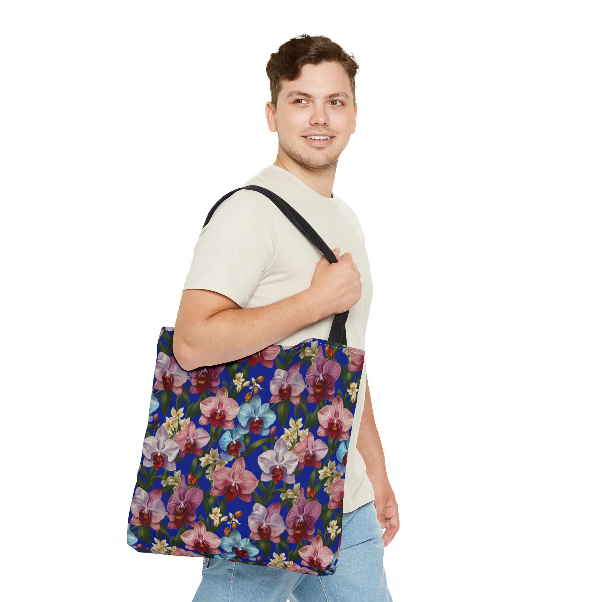 Crafted for both comfort and durability, the cotton webbing straps make carrying effortless all day long. Reinforced double-stitched seams on the Wild Orchids Tote Bag ensure it stands up to consistent use. The eye-catching orchid print on an electric blue background offers a bold, contemporary aesthetic, with a choice of handle colors to add your personal touch. Perfect for daily errands or a sunny getaway, this tote infuses your lifestyle with a vibrant, expressive style.
