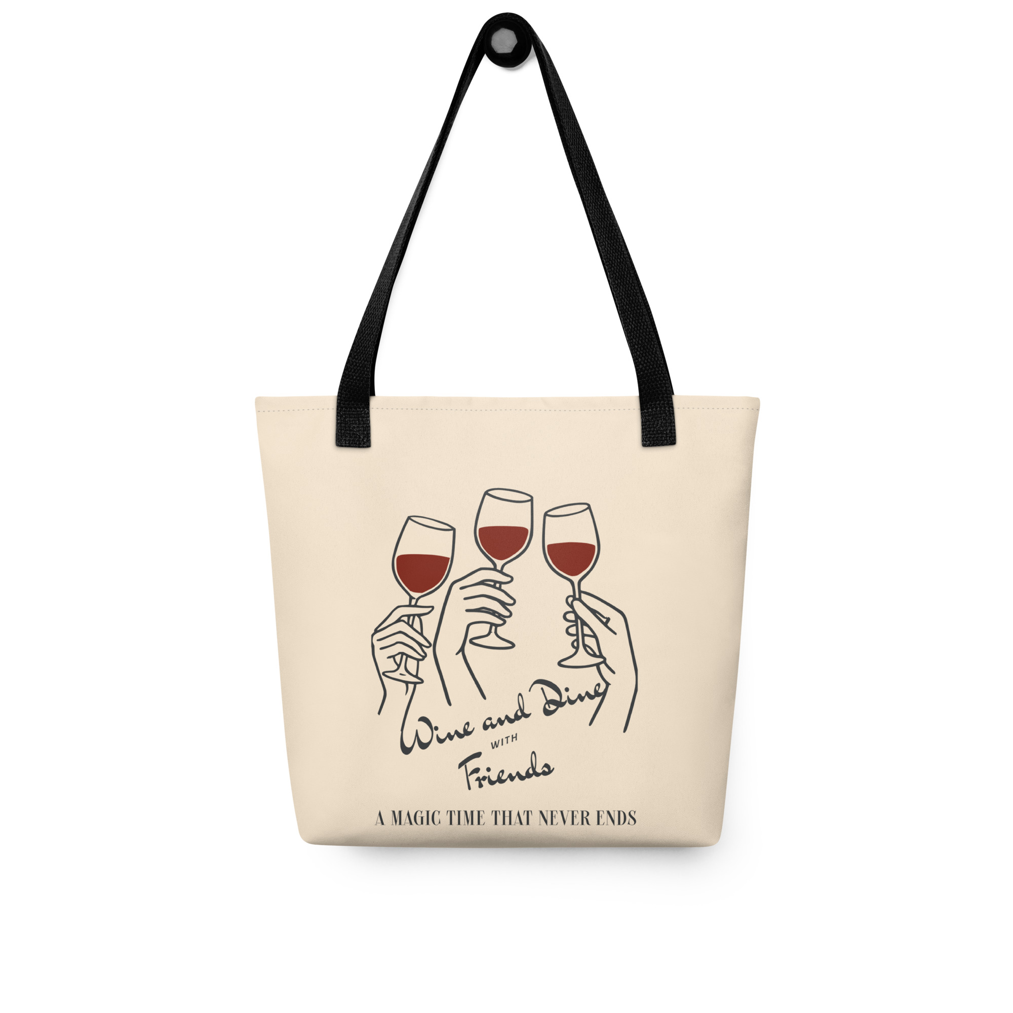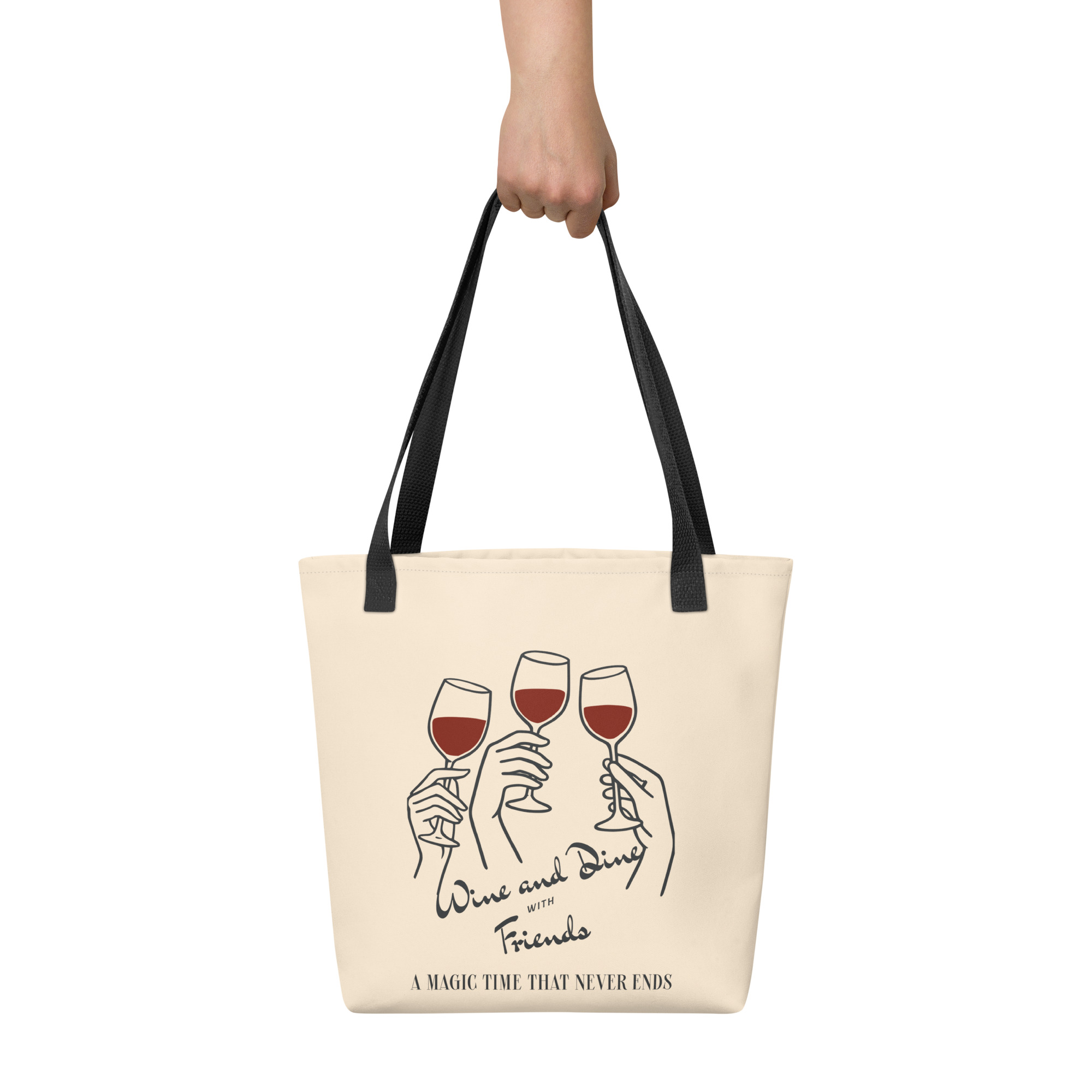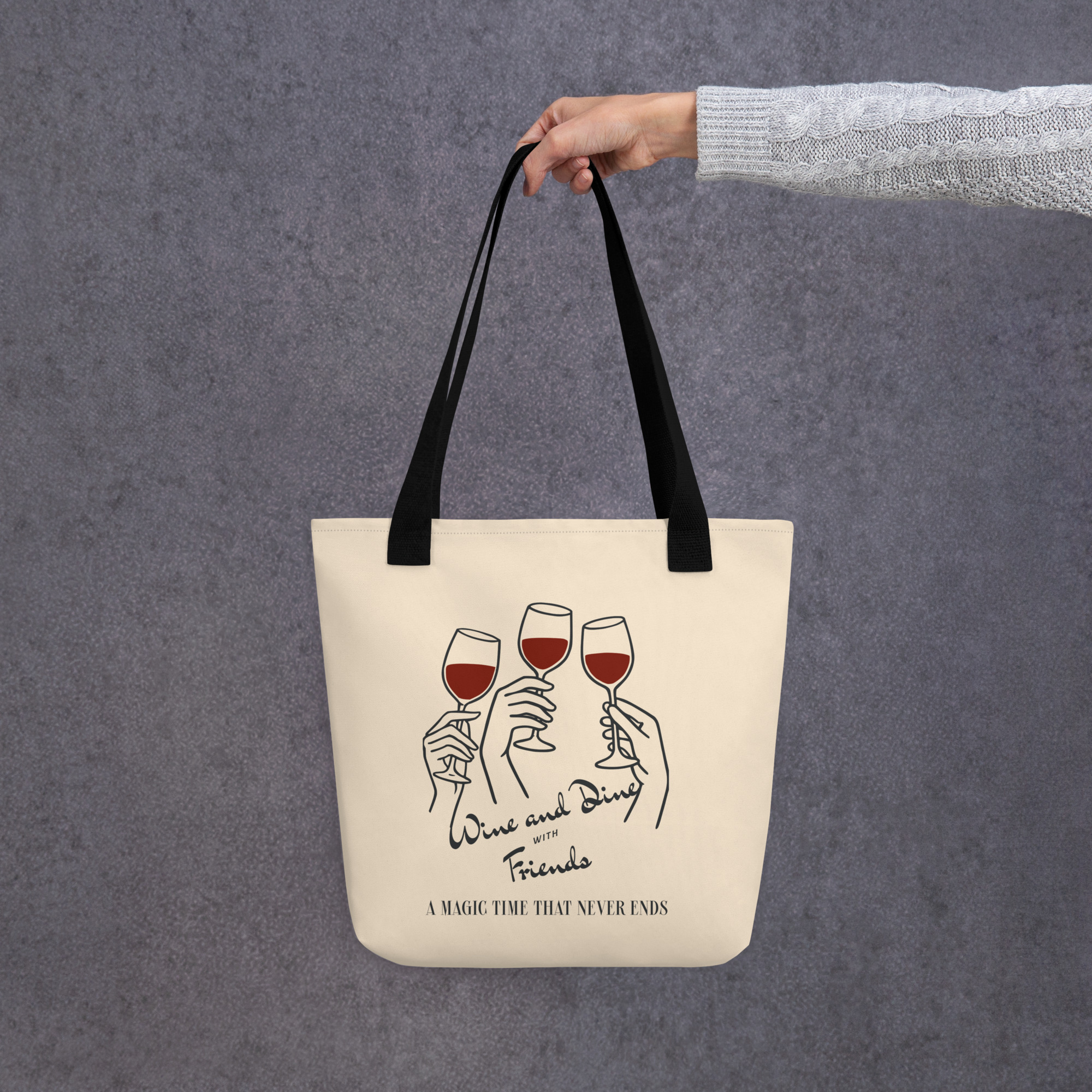 This spacious and trendy Wine Dine Tote Bag is perfect for carrying all your essentials. It can hold up to 44 lbs (20 kg), making it strong enough for groceries, books, or everyday items, all while looking stylish.