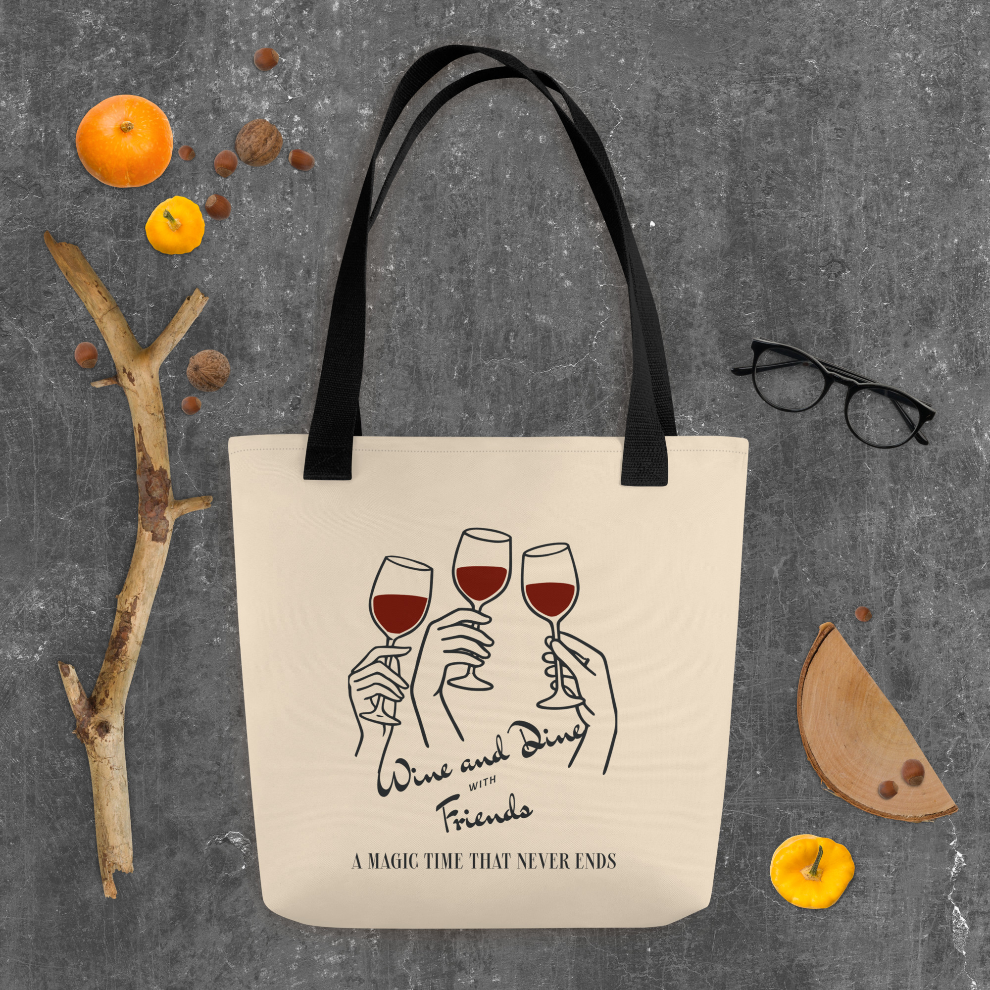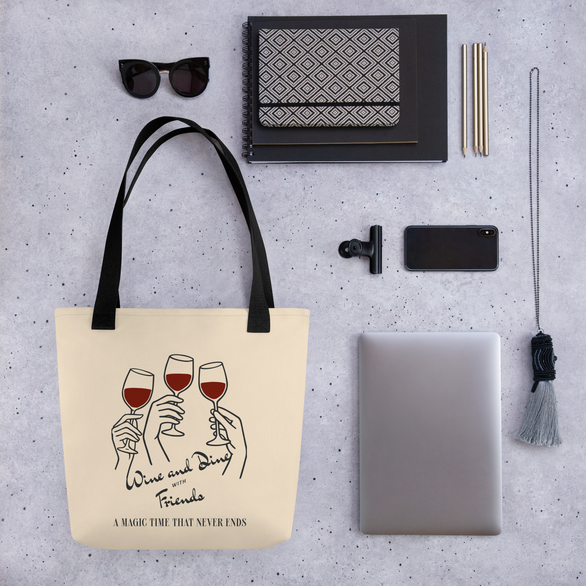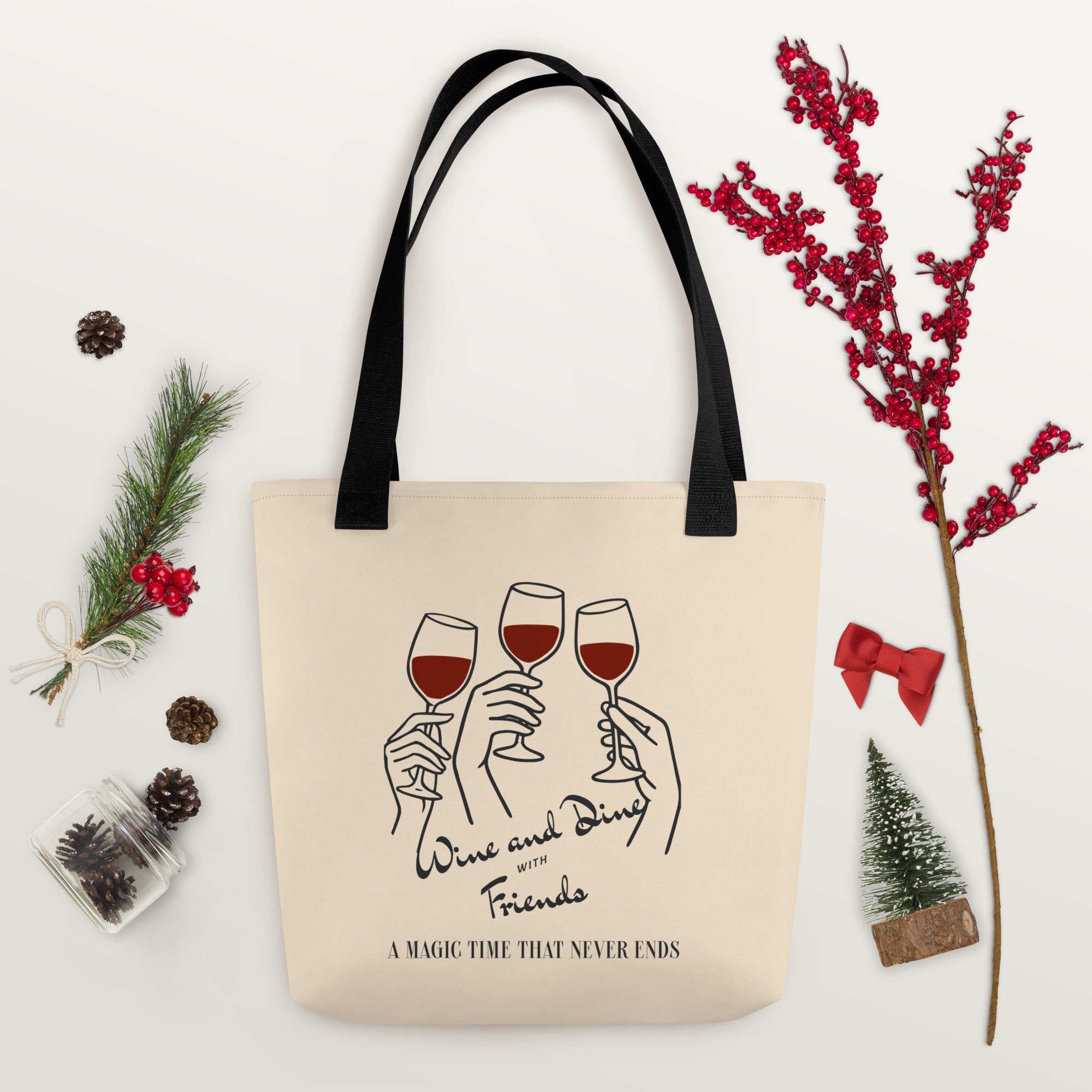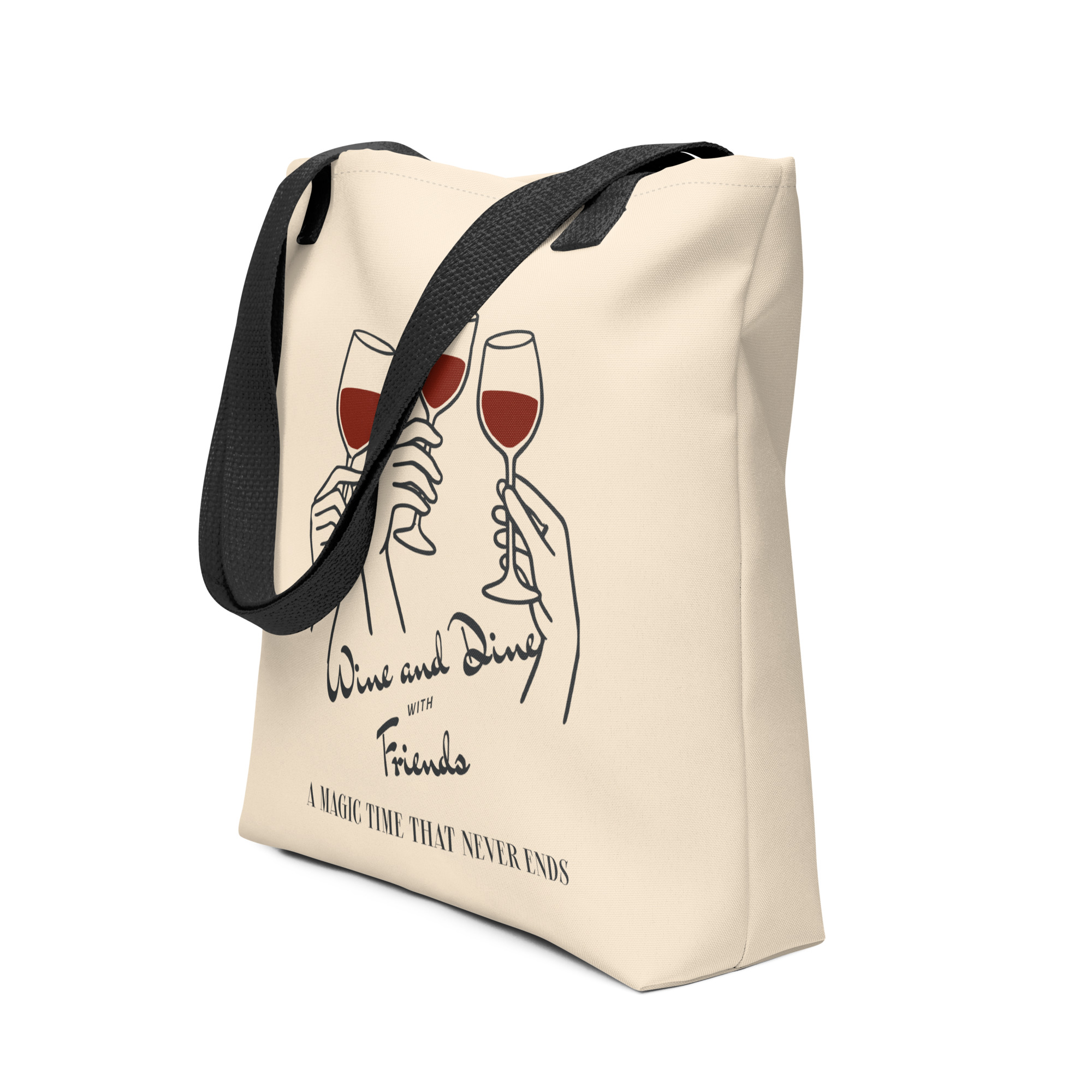 This spacious and trendy Wine Dine Tote Bag is perfect for carrying all your essentials. It can hold up to 44 lbs (20 kg), making it strong enough for groceries, books, or everyday items, all while looking stylish.