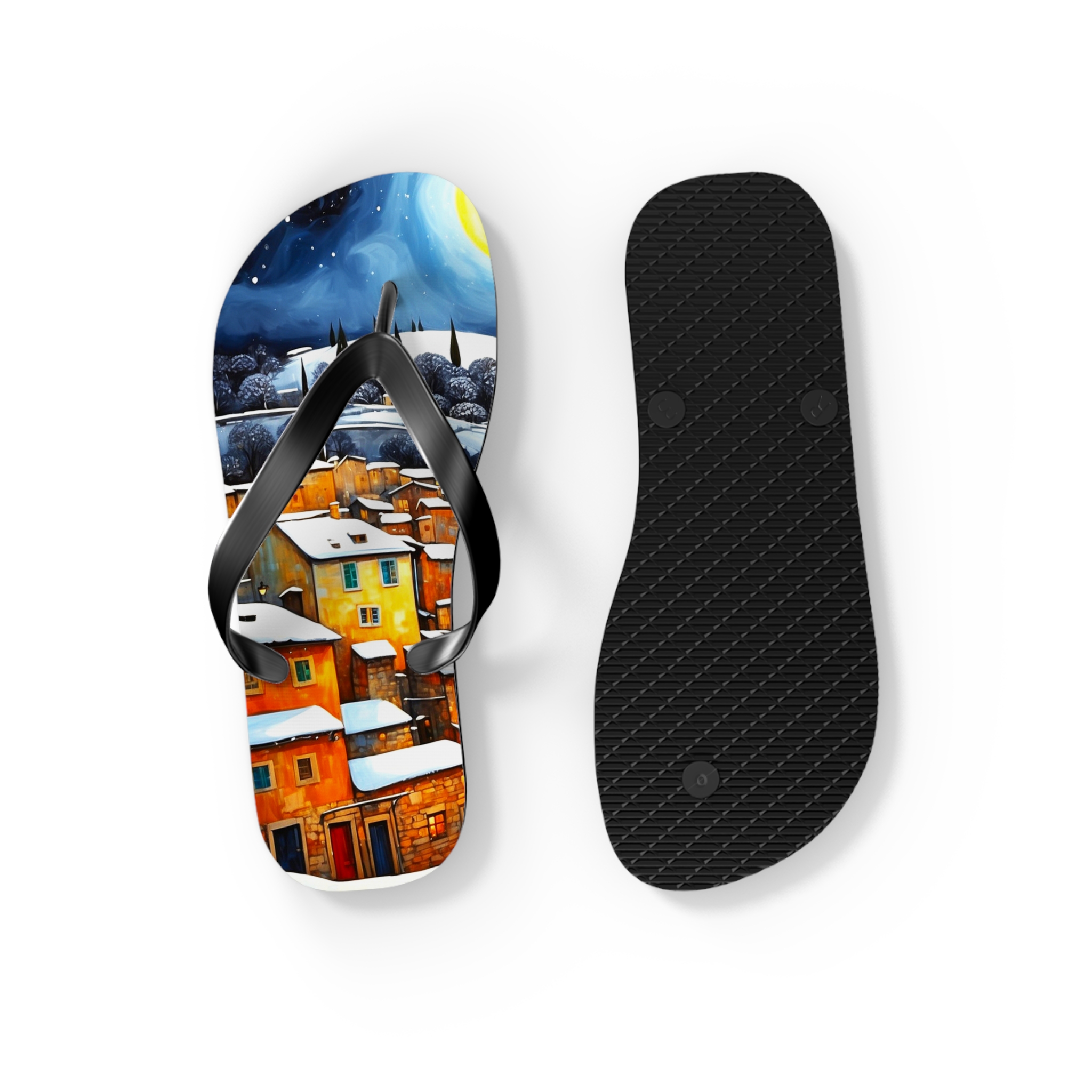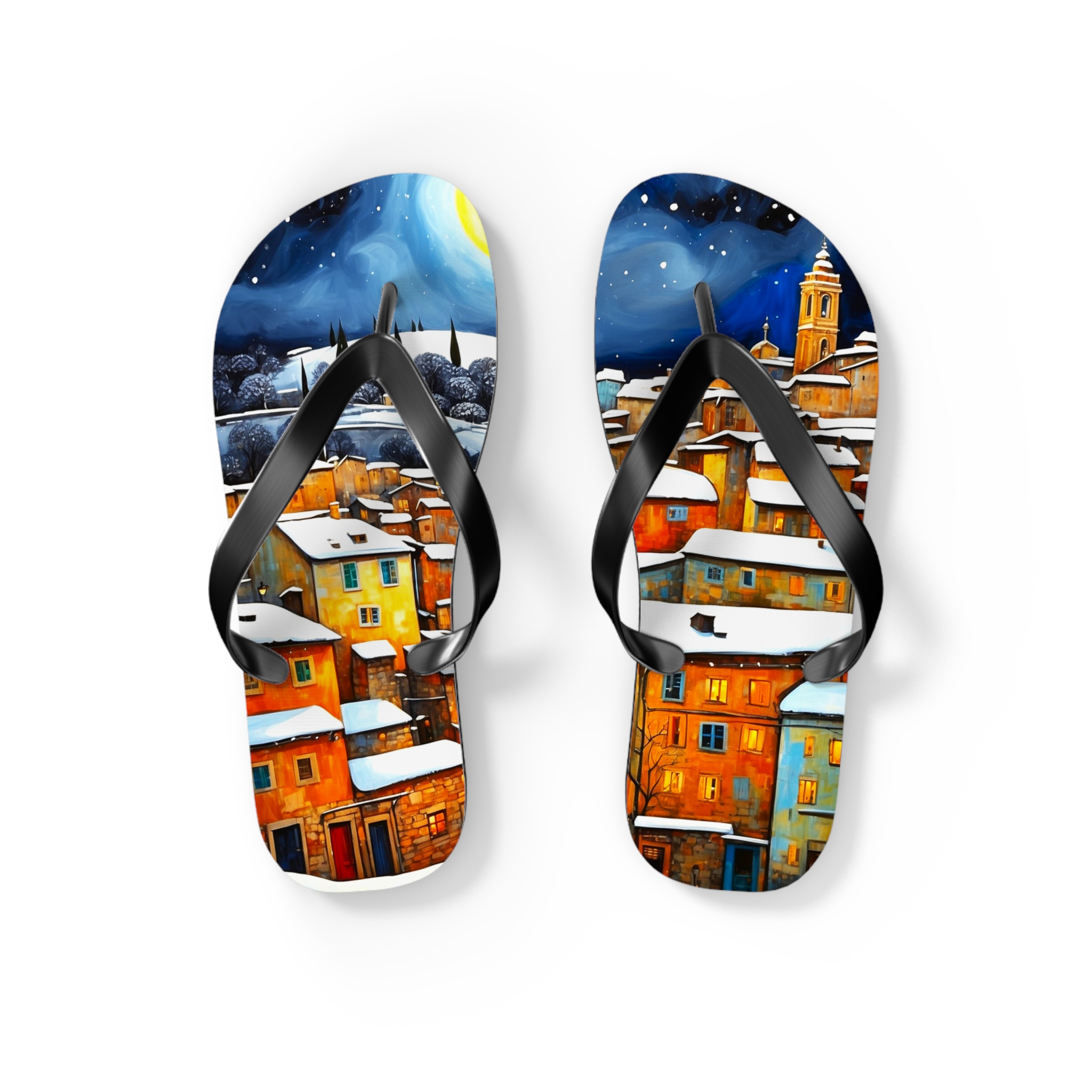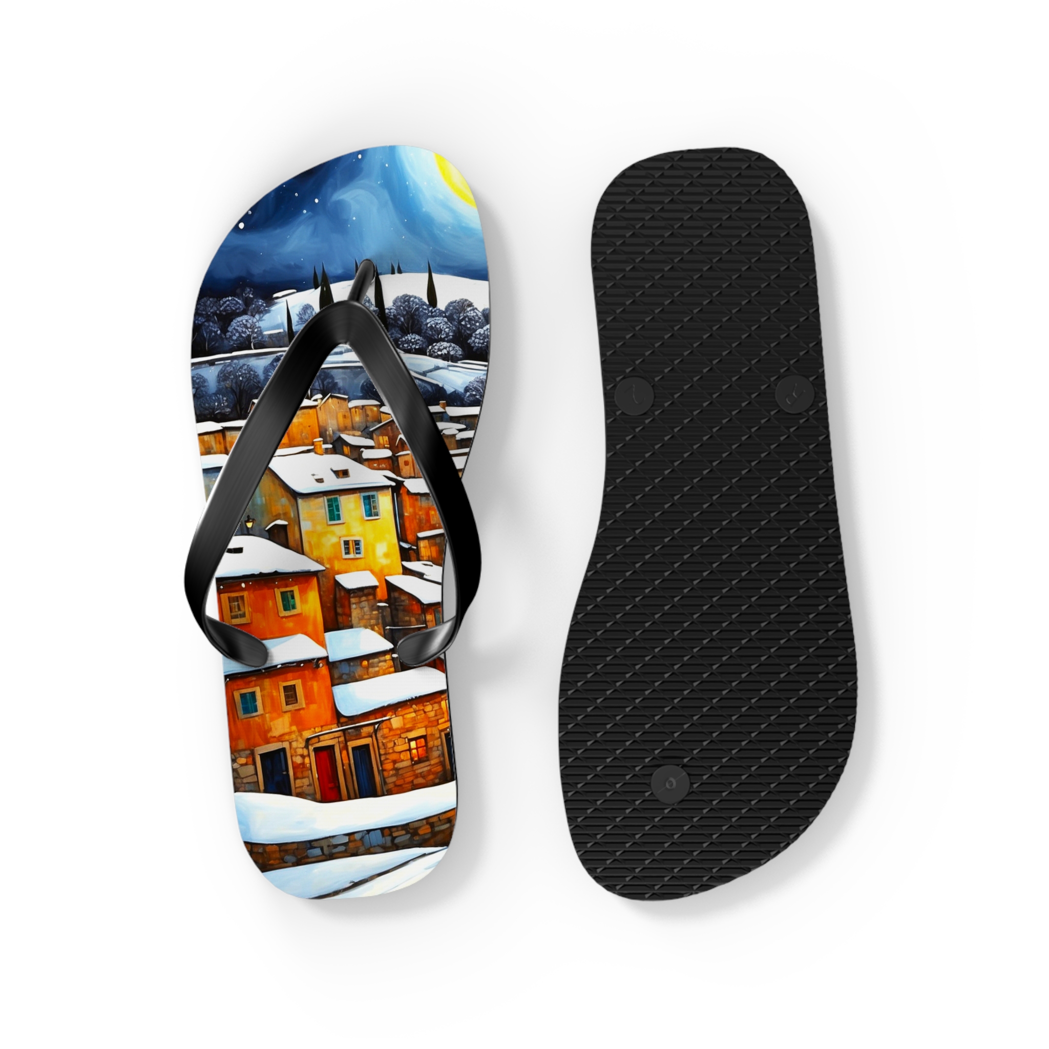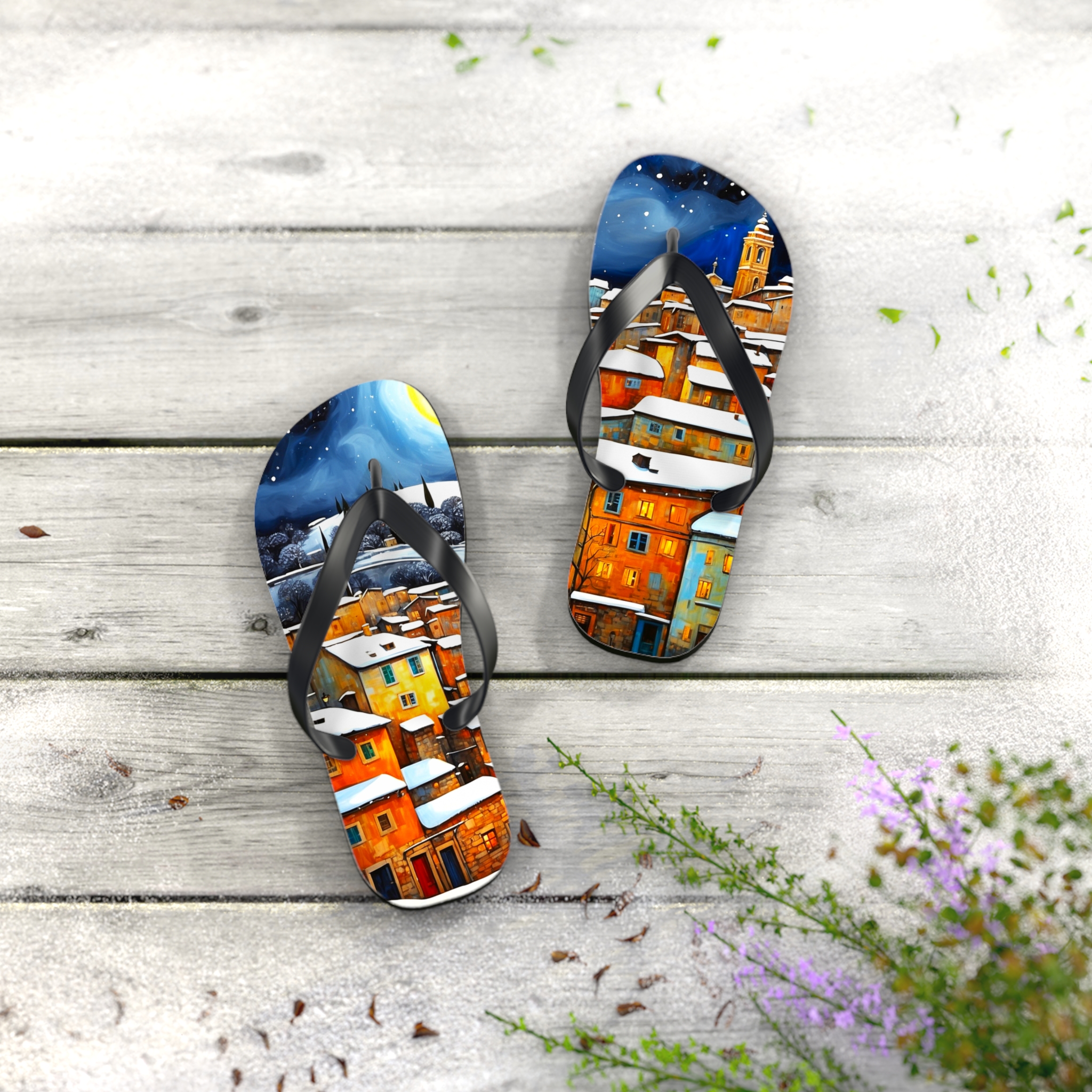 Get in the summer mindset with our Winter in the Village Flip Flops, designed for beach days and outdoor escapades. Uncover unbeatable comfort and style with our personalized flip flops, boasting high-quality printing and a padded footbed.