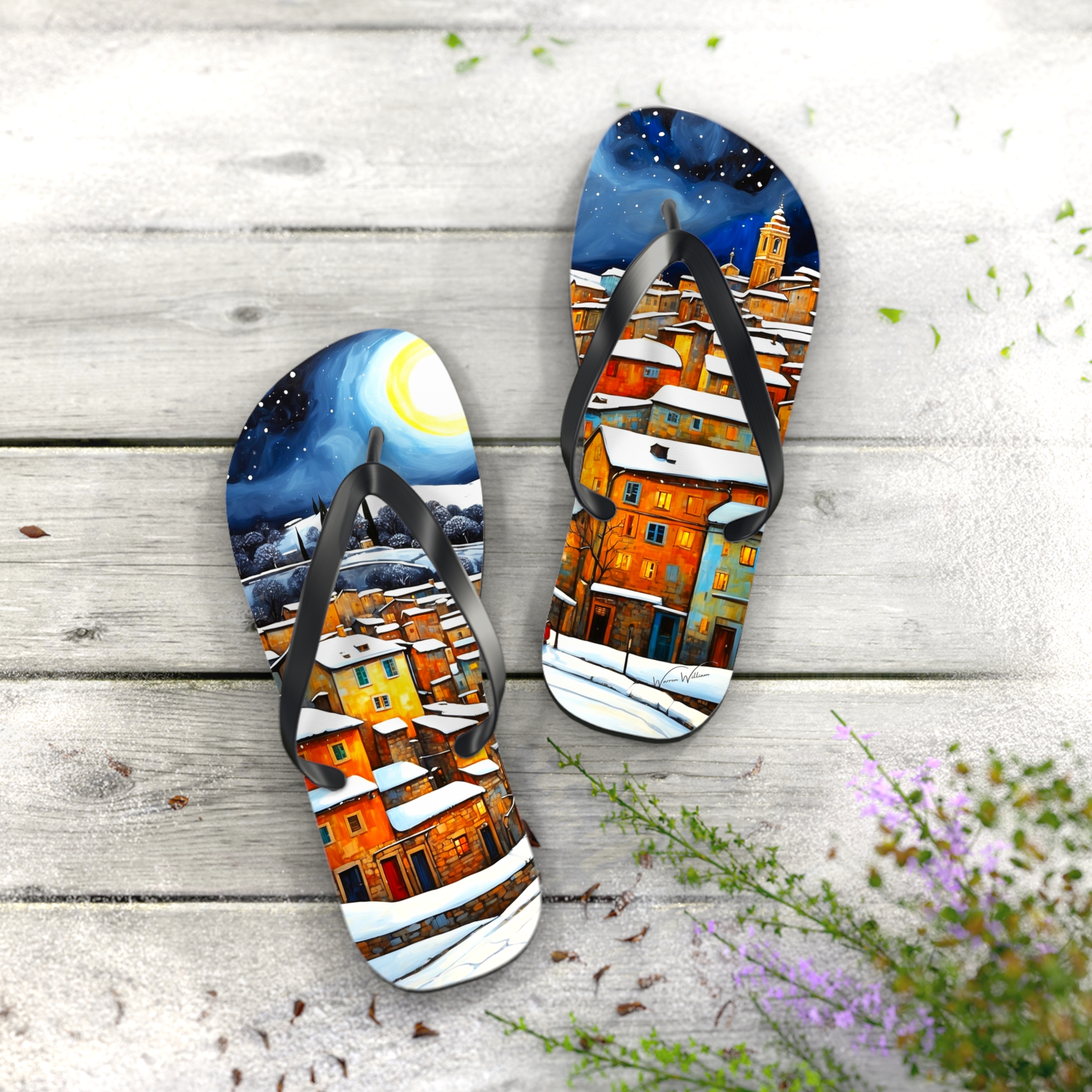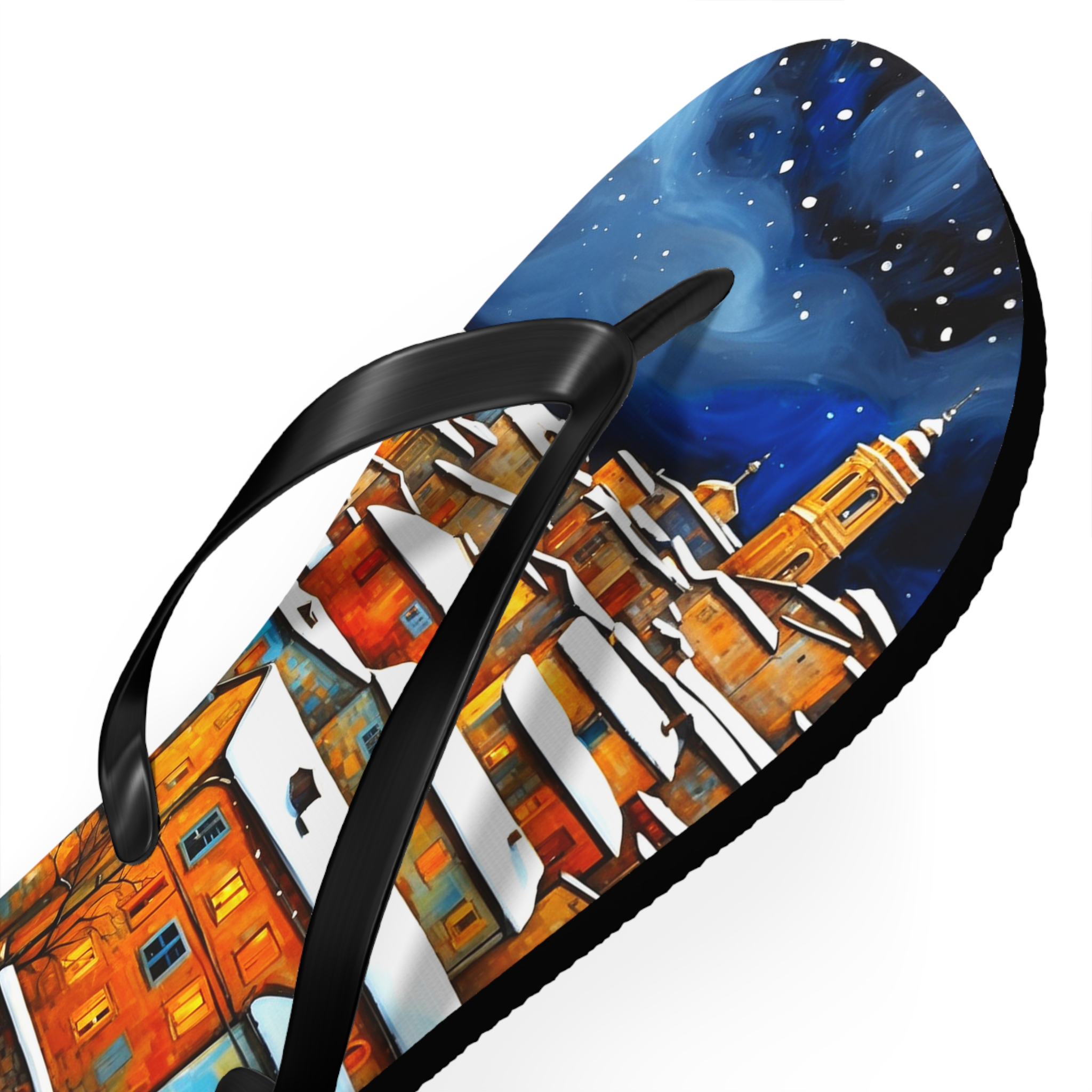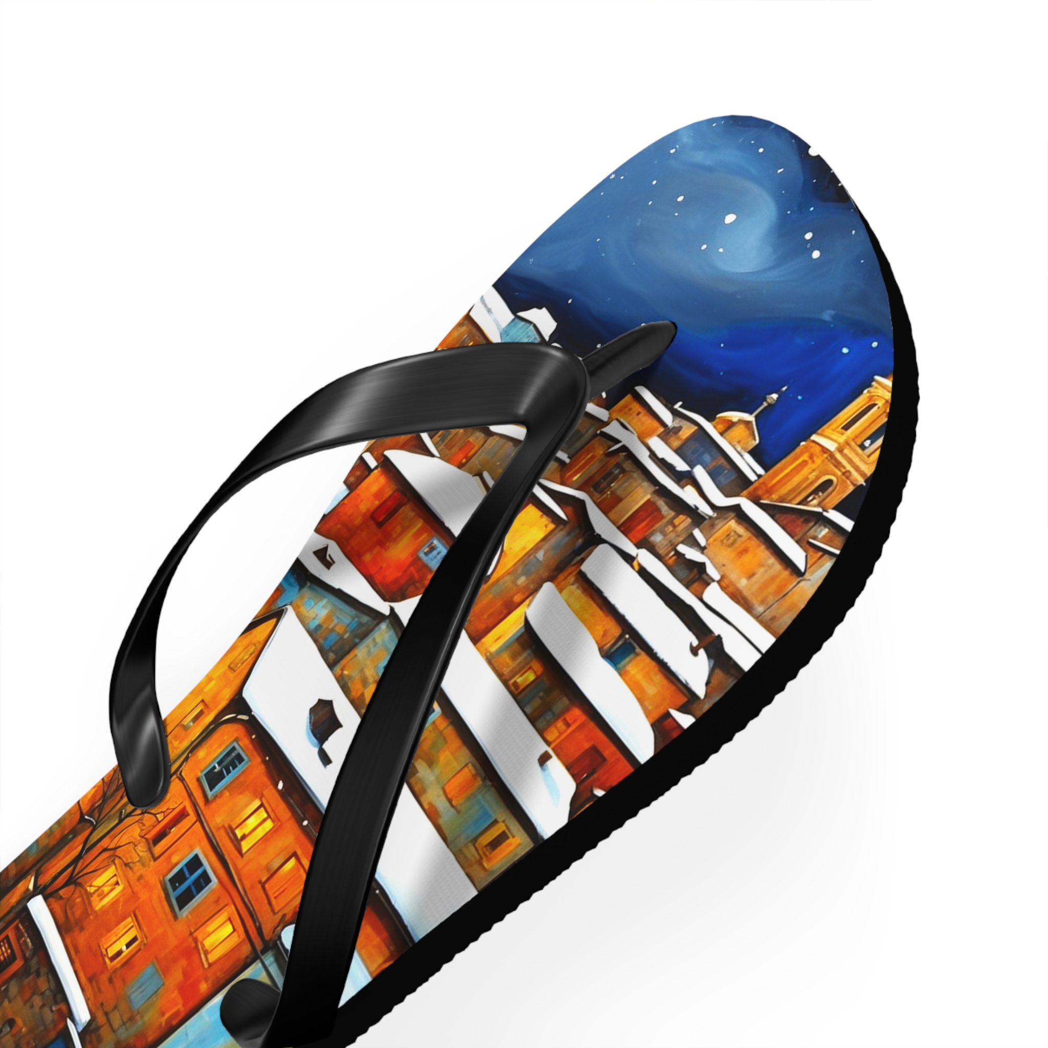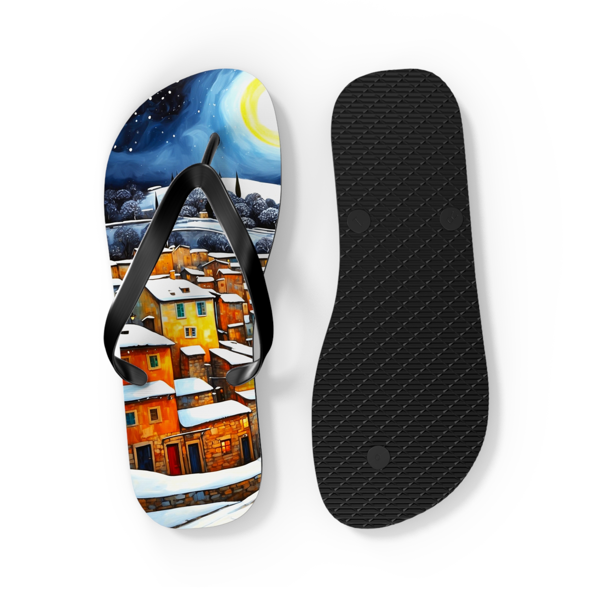 Get in the summer mindset with our Winter in the Village Flip Flops, designed for beach days and outdoor escapades. Uncover unbeatable comfort and style with our personalized flip flops, boasting high-quality printing and a padded footbed.