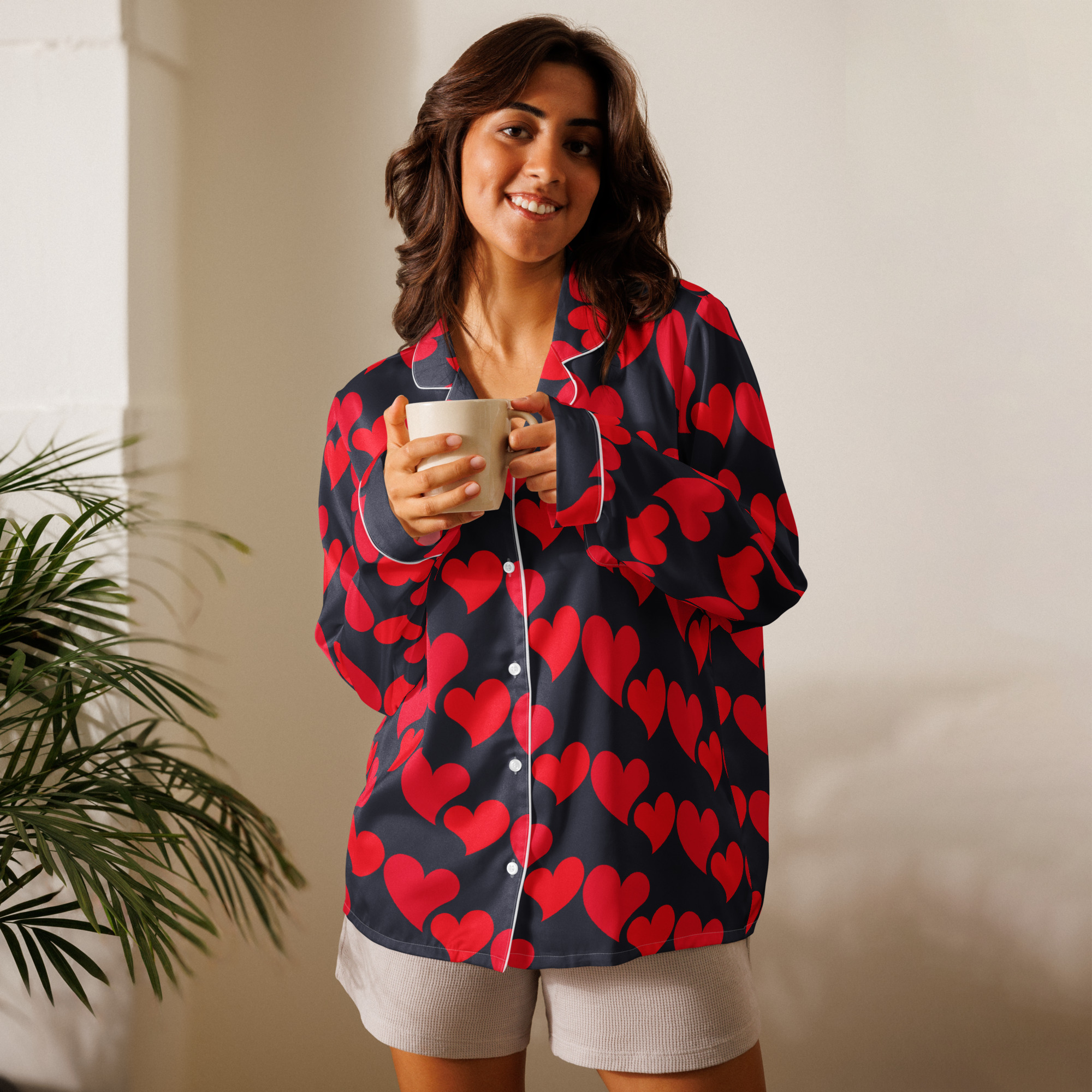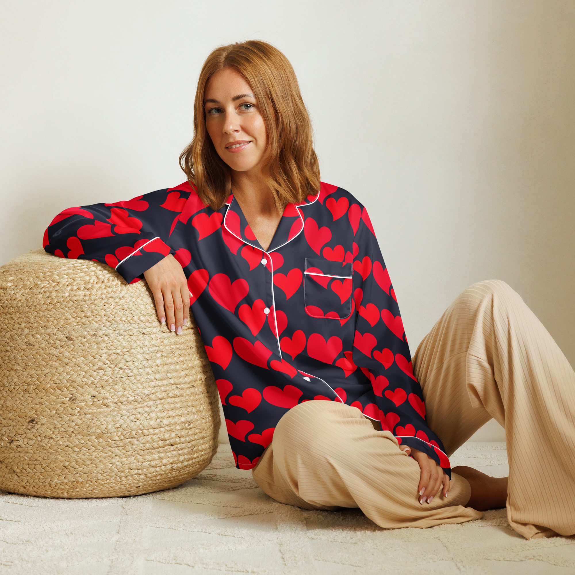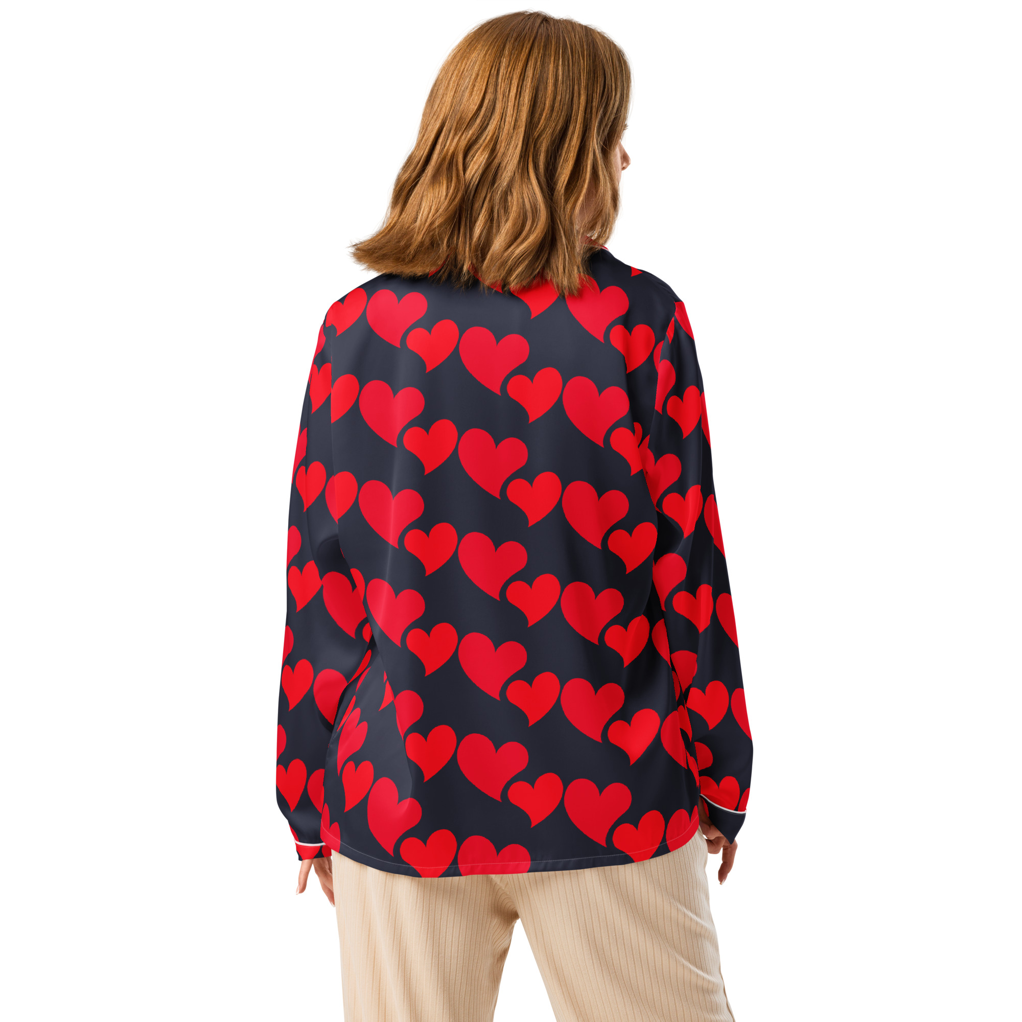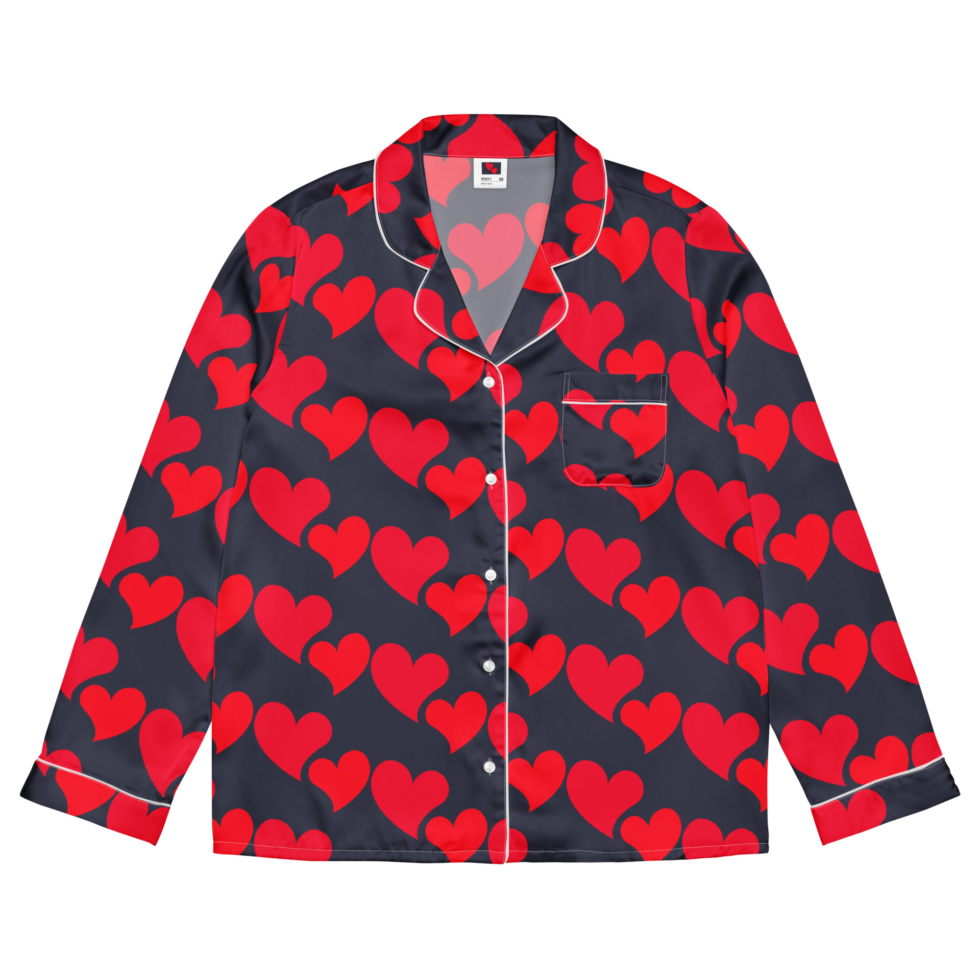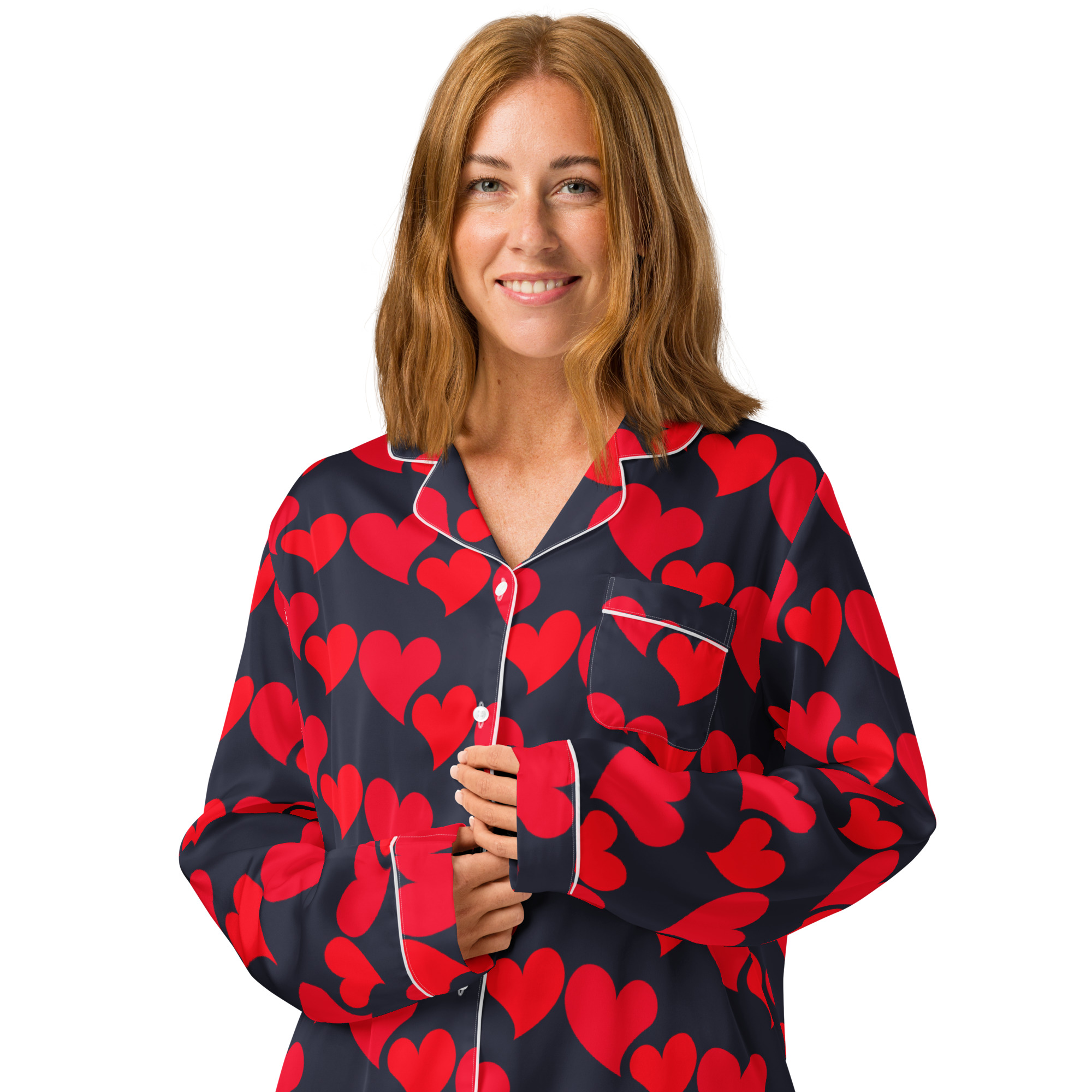 The silky-smooth Wonderful Red Hearts Pajama Top is perfect for a relaxing day, offering both comfort and a touch of elegance. Its relaxed fit allows for easy movement and a flattering drape that holds its shape. This top also includes a chest pocket and stylish piping details.